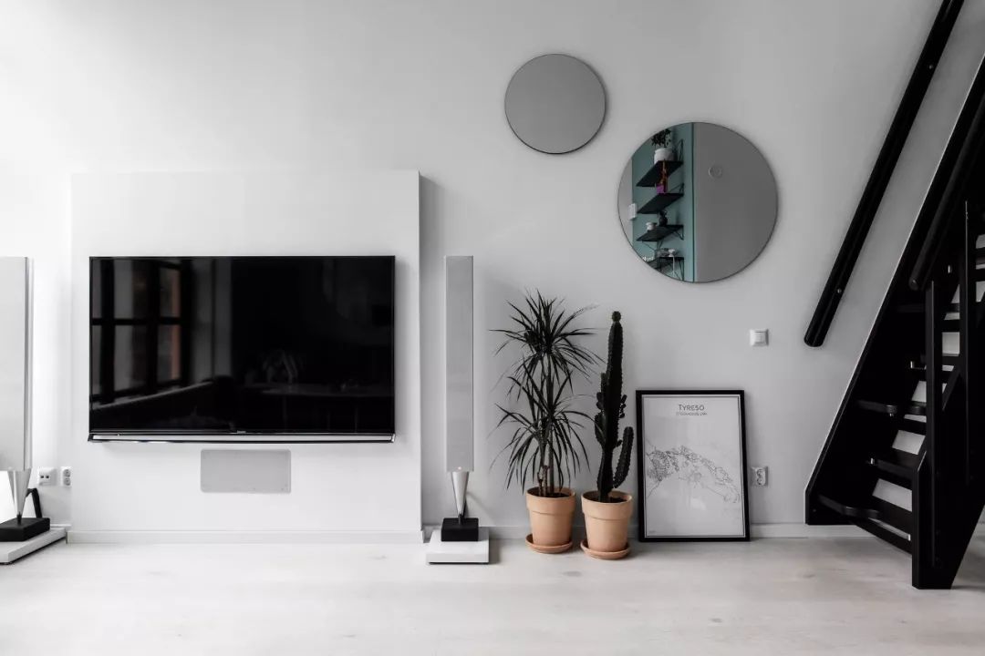 ▲ 电视背景墙面延续白色为基调,突出的电视机立面增添墙面层次,再布置大小不同圆镜与绿植以及装饰画,呼应沙发背景的同时点缀过于空白的空间