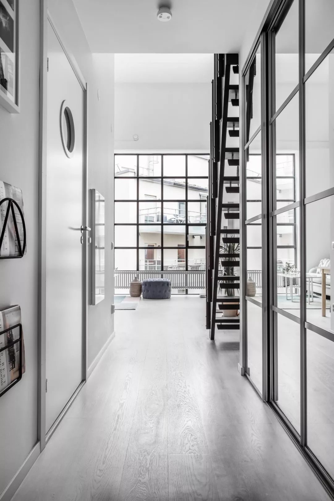 ▲ 客厅地面延续灰色地板,白色的立面墙与大面积的黑框格窗,让空间采光极佳