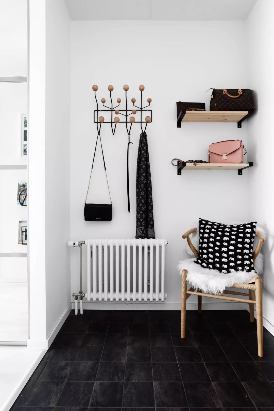 ▲ 设计师以现代简约为设计主题,运用黑白交替的设计元素,打造低彩度的阳光公寓,入户黑色的瓷砖地面,搭配白色墙壁,铁件挂钩,置物层板,一把原木休闲椅让换鞋更加便利
