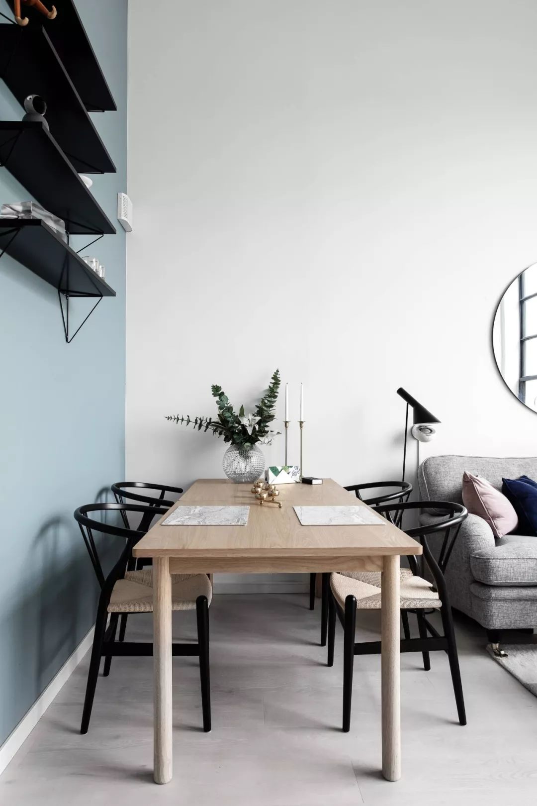 ▲ 沿着入户过道到餐厅区域,地面通铺木质地板,白色墙面搭配清新蔚蓝色的背景,黑色铁件层板与黑色餐椅呼应,可伸缩的原木餐桌,可以同时容纳多人用餐