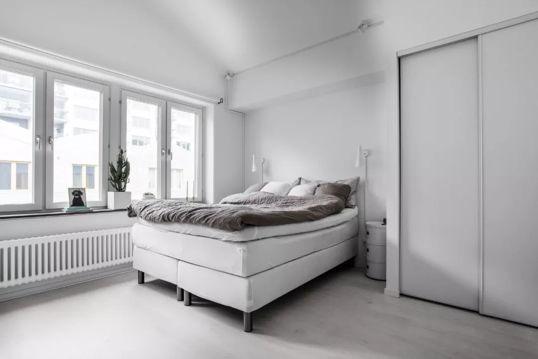 ▲ 二楼的卧室区域,地面通铺地板,延续纯白的空间,仅以少量的黑色元素点缀出低彩度的就寝环境