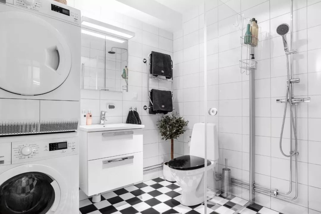 ▲ 卫生间采用黑白小方砖,铺贴出棋格形式的地面,搭配墙面的白色瓷砖,将洗衣机与烘干机带进卫浴空间