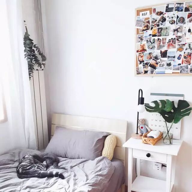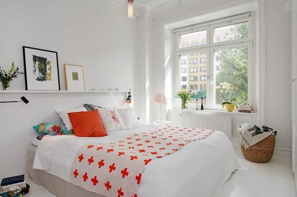 大片的留白难免让卧室空间略显单调,这时候利用亮色的小物件,例如抱枕、床铺等来转移卧室的整体视觉,聚焦在亮色焦点上,也有助于小卧室“变大”。