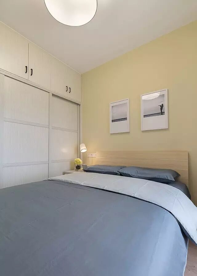 除了选择浅色系显大之外,卧室的背景墙和家具、窗帘等的软装色彩要保持统一,减少繁杂的色彩带来的杂乱感。统一色系有助于空间的延伸。