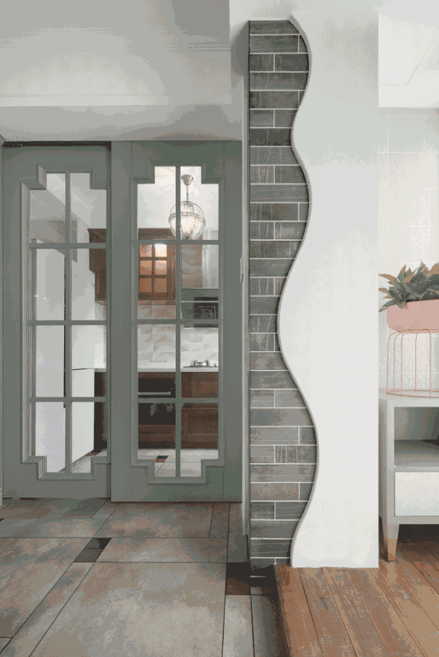 餐厅靠近休闲小阳台,后方是L型厨房,复古柜+灰色瓷砖墙,整齐干净。虽然开放式设计会比较通透,担心油烟问题的屋主还是设计了玻璃门挡油烟,平时不用藏在墙里就好了。