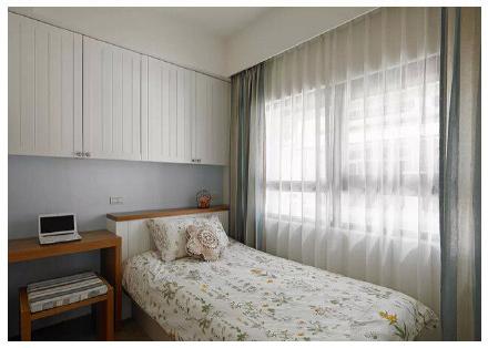 次卧的设置也很简洁,同样帷幔的窗户设计,碎花的小床,白色壁挂的柜子。简单地家具将房间室内轻松搞定。