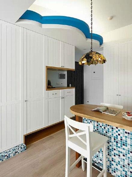 入户门处设计成海滨风情,船舵悬于门上,将原本简单的门点缀成一个美丽的家居角落。入户之后便是一处小吧台,可以是餐桌、可以是休闲处,早起喝杯咖啡,夜晚饮一杯酒,既省空间又分外别致充满情趣。小户型家居扩容、浪漫必备:吧台装修。