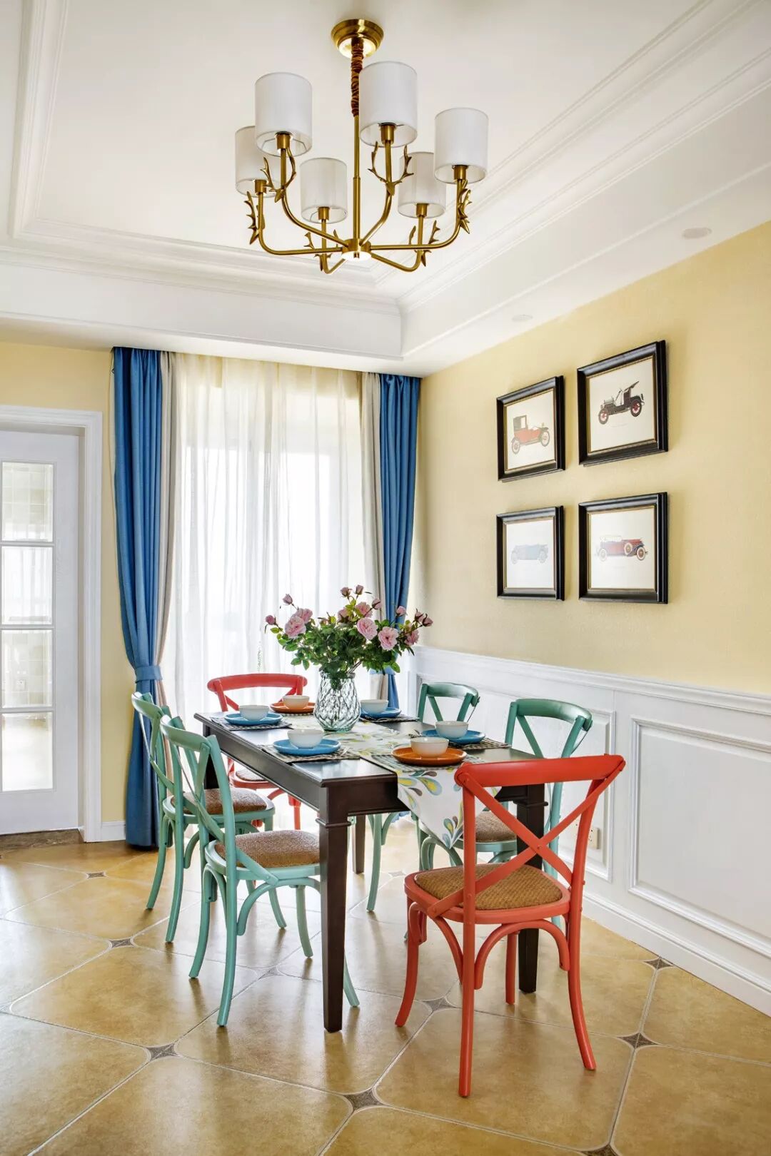 彩色的餐椅与窗帘丰呼应,层次丰富,桌盛开的鲜花,使一切看起来如此美好。