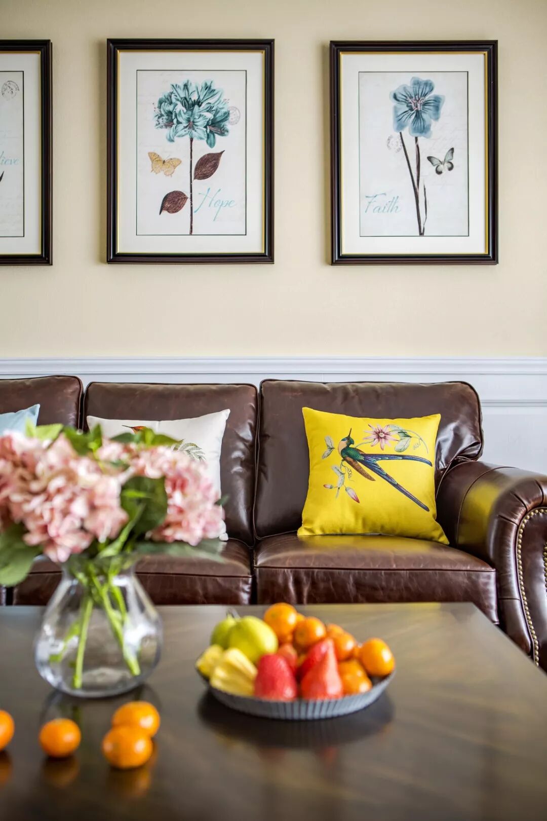 沙发背景的装饰壁画与欲欲出笼的鸟儿不禁让人想到诗句“色与声俱妙,鸟啼花乱开。”这样一幅鸟语画香的景像,真的让人倍感放松。