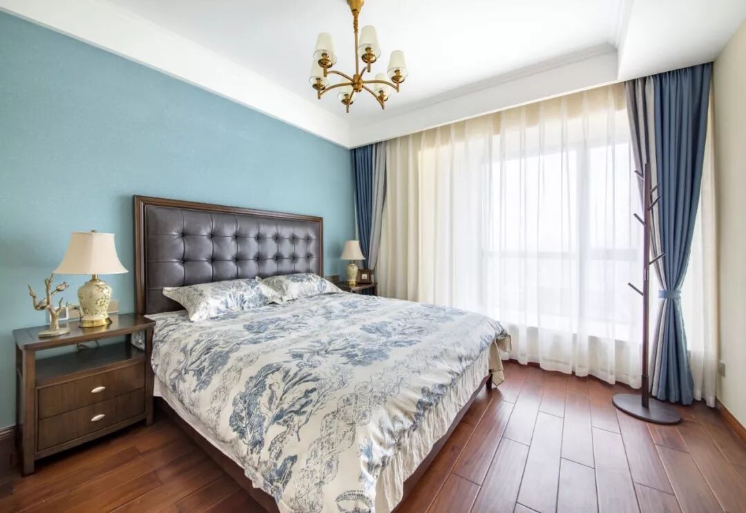 主卧背景墙使用了马卡龙蓝色,与窗帘的淡蓝色不同,两种不同的蓝色表现出了层次感,也与深色的家具形成对比,整体优雅内敛。
