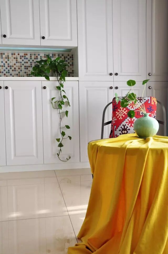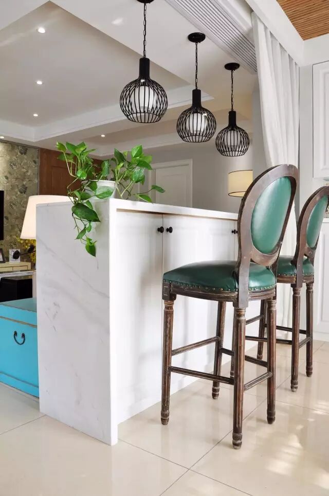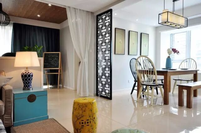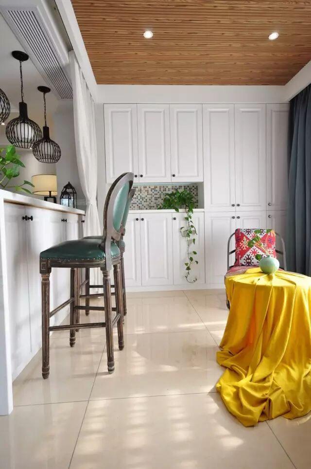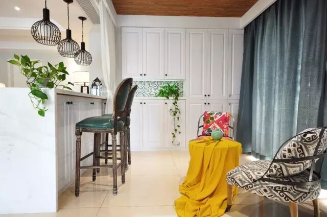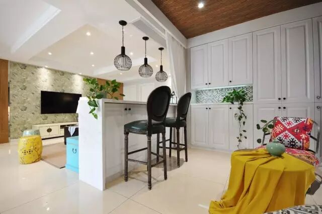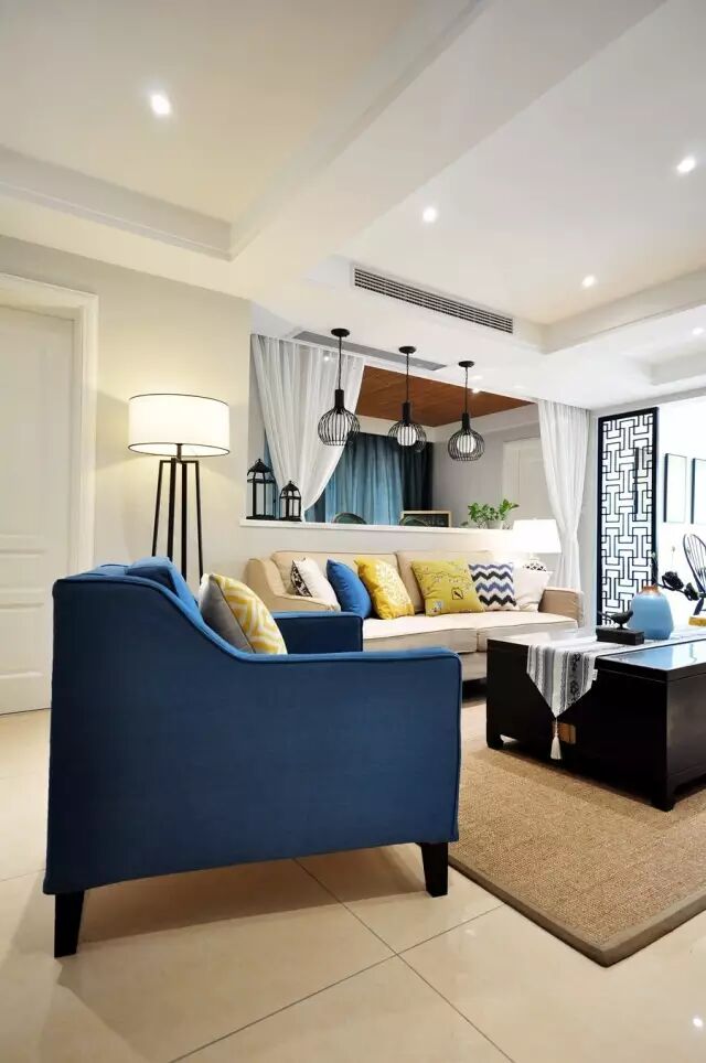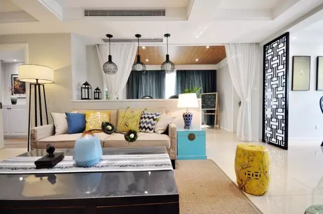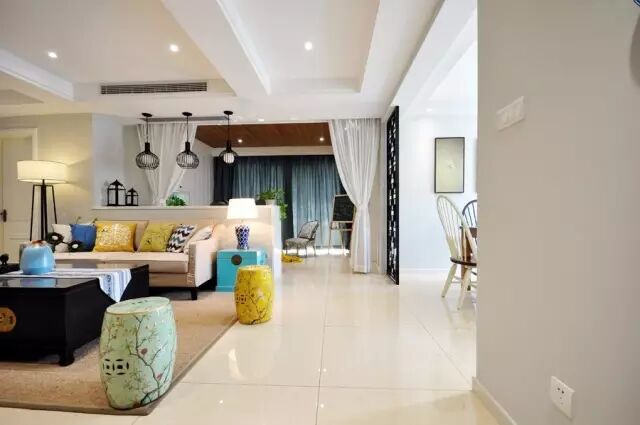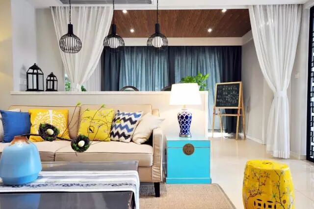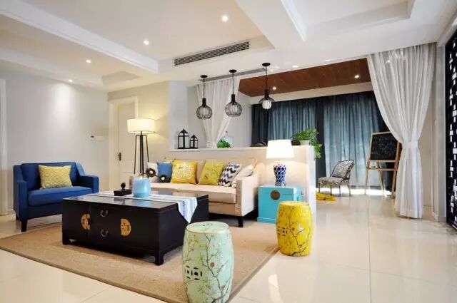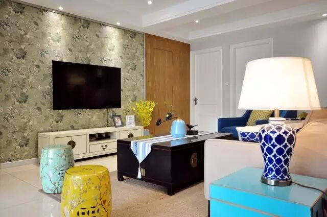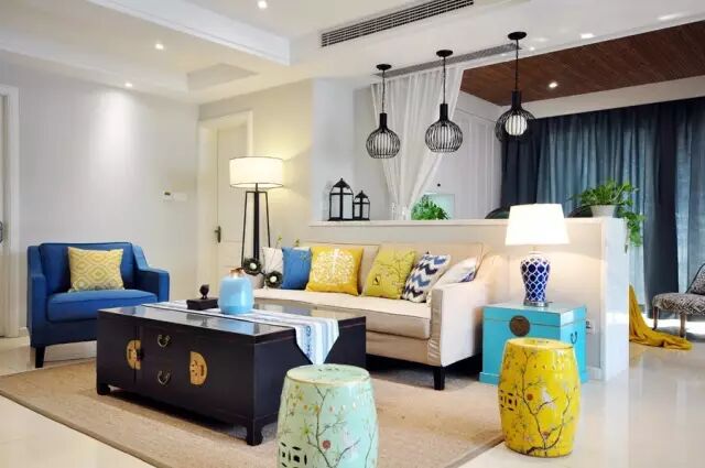 蓝黄白经典色系,加以绿色作为点缀,家具结合美式沙发与中式茶几、电视柜的组合,再配上中美皆宜的鼓凳,色差靓丽清新,整体给人非常舒适的感受。
