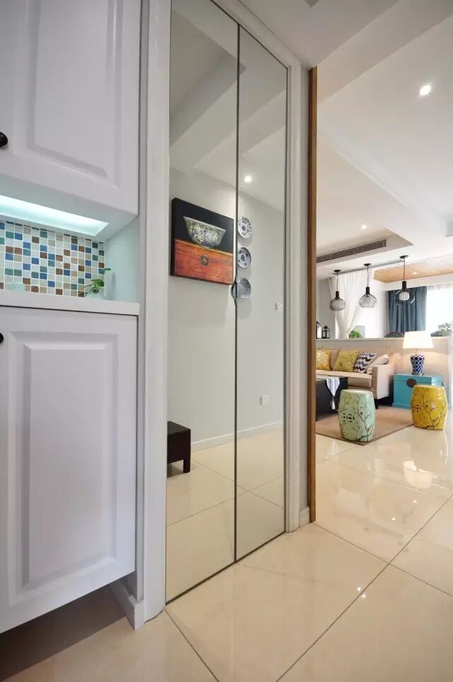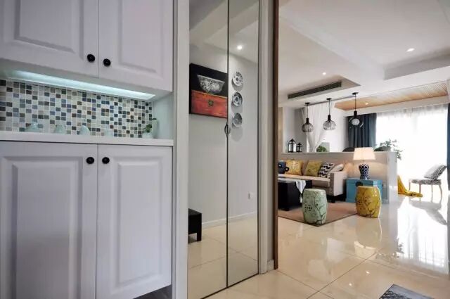 进门玄关处储藏间的门采用全身镜面的方式,镜面在视觉上可以在无形间扩宽进门过道的面积,加上进入后客厅沙发背景景观的点缀,公寓房也能做出豪宅的视觉效果。并且居住者在出门前也可以通过镜面审视自己的仪容妆扮,实用性也非常强~