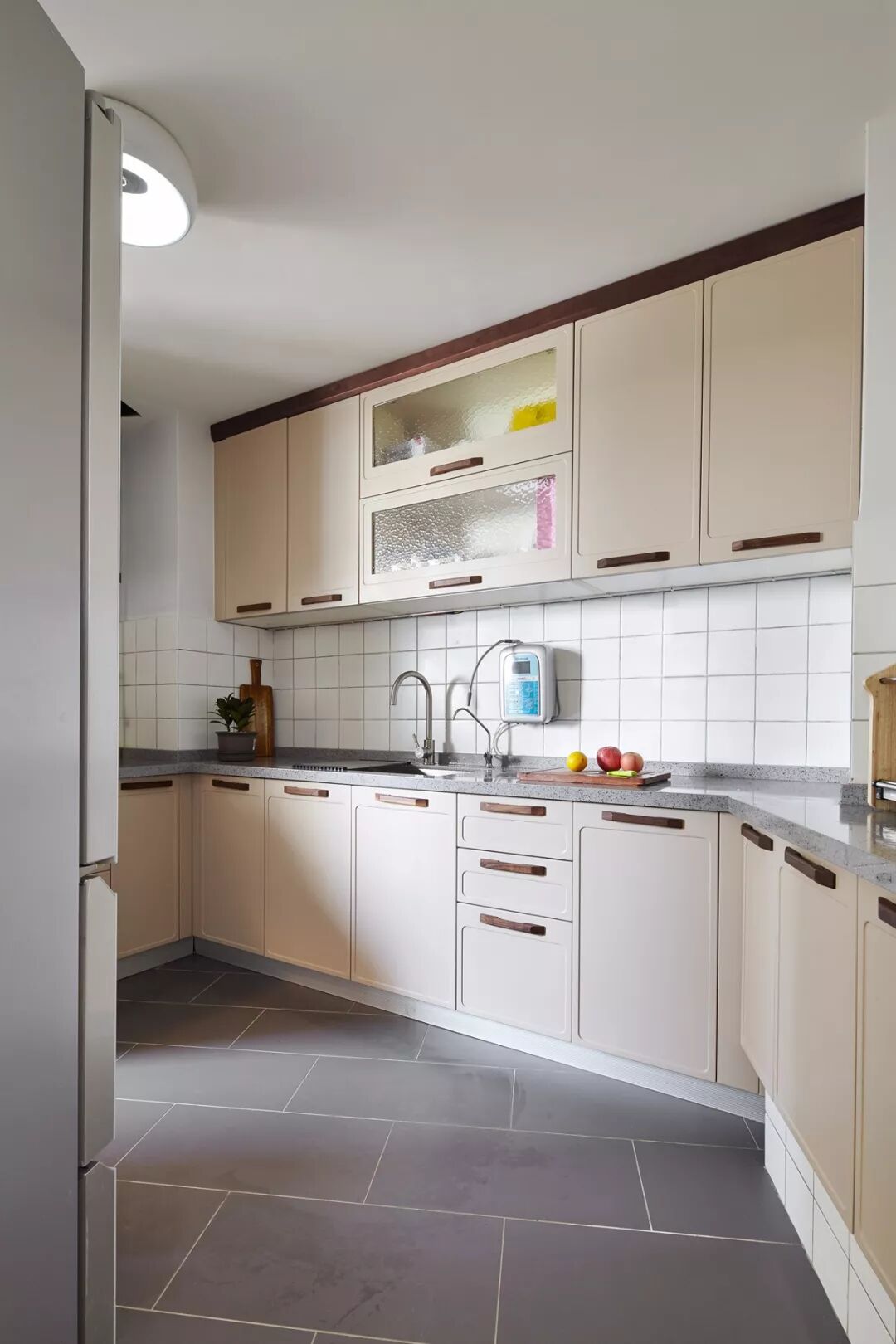利用清新北欧风,将不规则的厨房装成一个氧气十足的呼吸空间;而整体暖色调的厨房,整体式的橱柜、文艺白的墙砖与斜铺的浅灰色地砖相互协调,在整个空间上,给人视觉上的一致性。厨房通透明亮,简而温馨。
