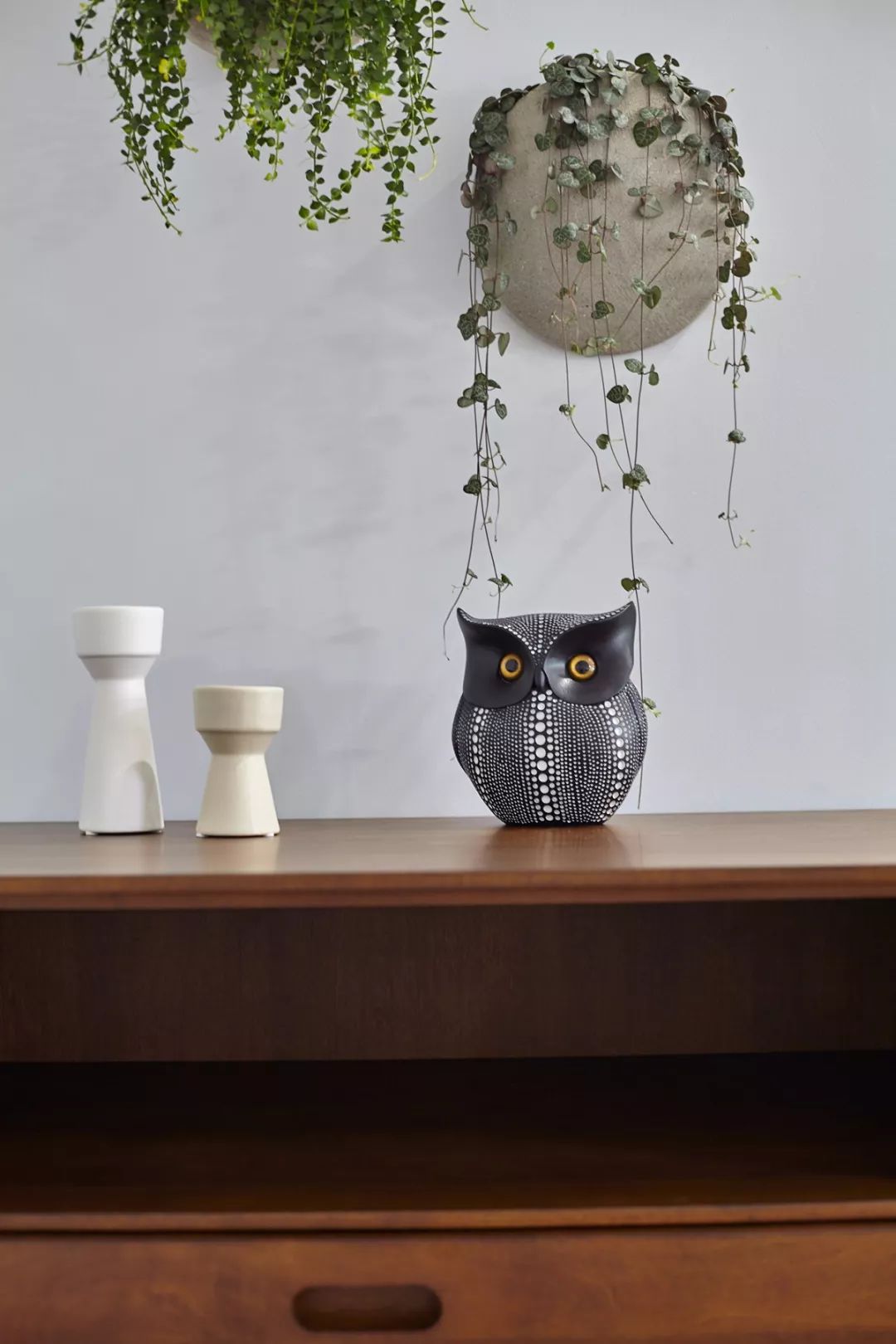 角落的餐边柜,上边摆一个猫头鹰的装饰与2个烛台,结合墙面上垂下来的绿植,让角落也散发出清新的活力气息。