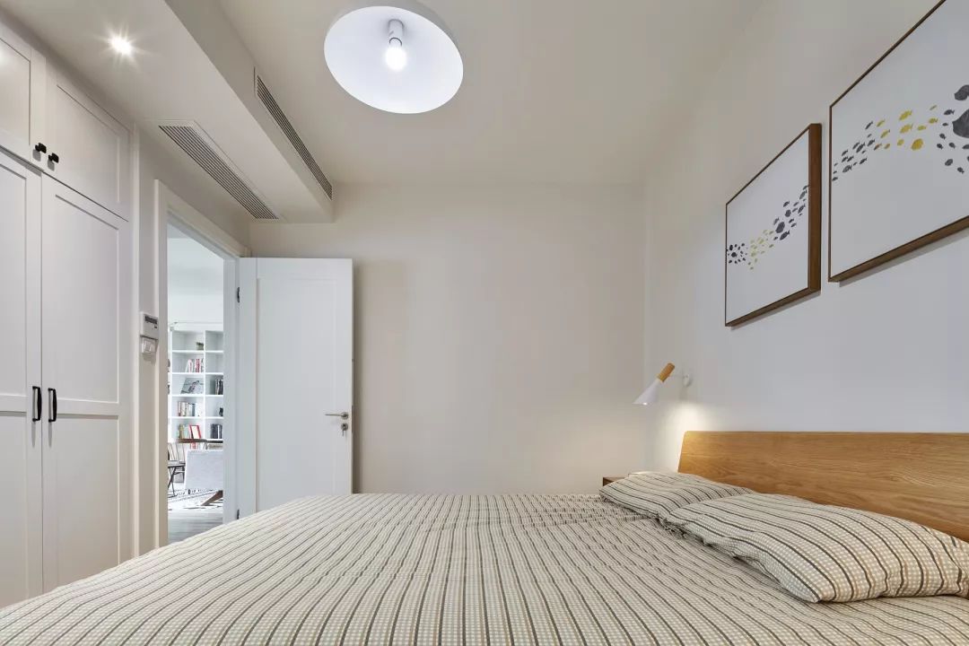 主卧以简约为主,融入文艺白、原木色为主色调,与室内的被褥、枕头等具有纹理的配置物浑然一体,给然衍生一种柔和亲近之美。