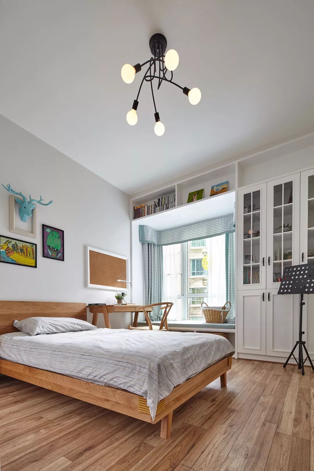 房内飘窗以隐匿收纳功能为主的窗台设计,白色橱窗式的储物柜,置物、置书两相宜,使整个空间格局更加干净大方。