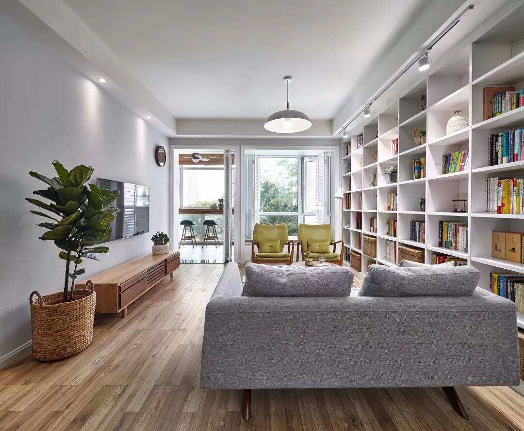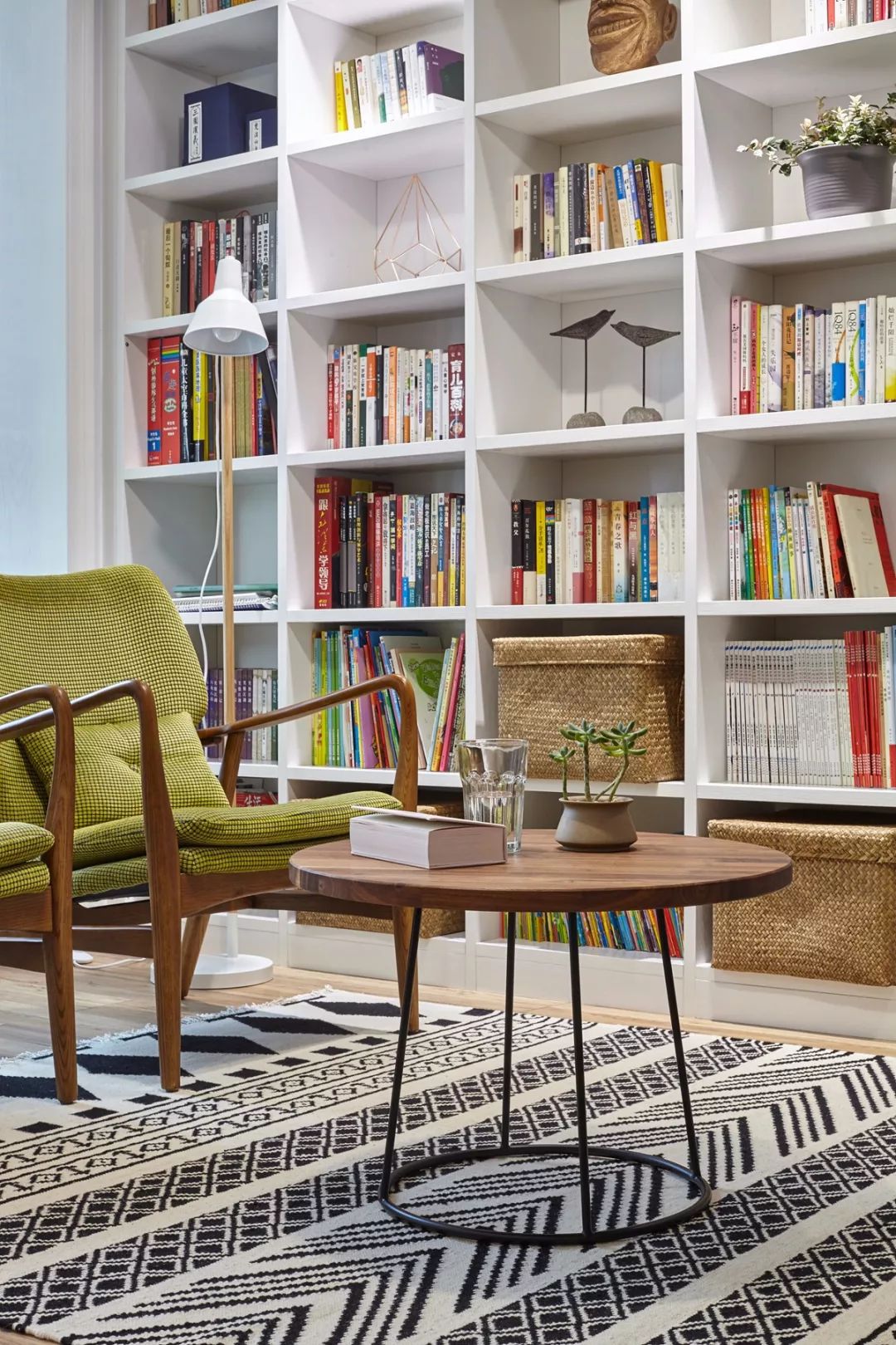 设计师摒弃传统中以电视为中心的设计理念,而是以一体式的开放式书柜作为侧重主体,融入主人的习惯喜好,使整个客厅极具故事性和功能性。