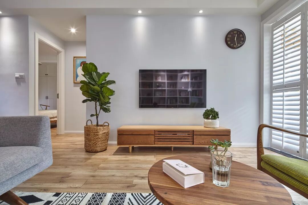 电视采用挂置墙上的方式,不仅使整个设计更加简约,也为地柜节省了空间。左右两旁种植的植物浑然天成,与整体风格协调一种,更增添了一抹生机、绿意。