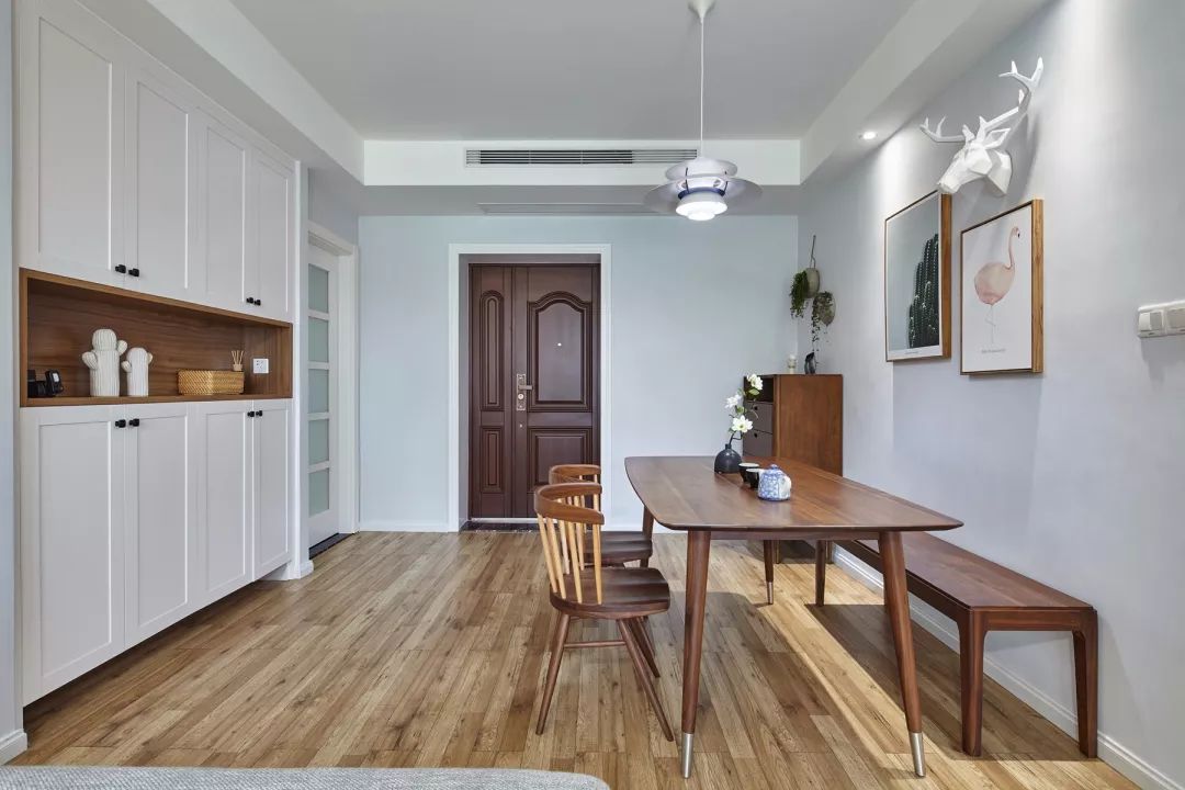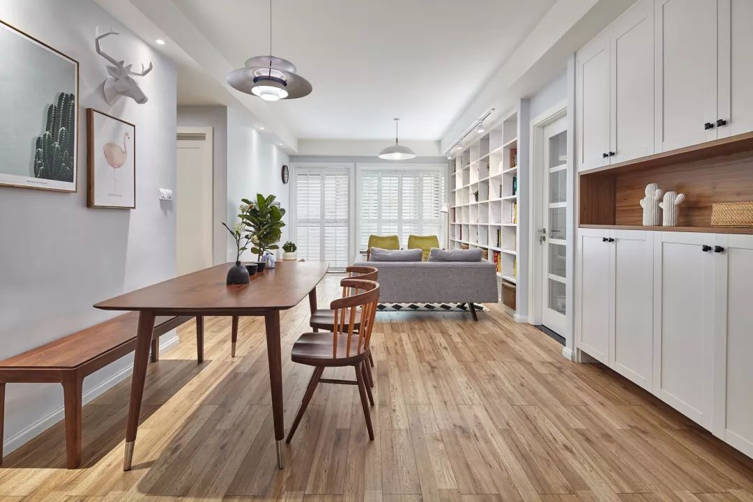 入门处,简约而又不失风度的北欧风餐厅映入眼帘,客厅一角的图书墙为其增添了一抹饭后闲情的雅致。