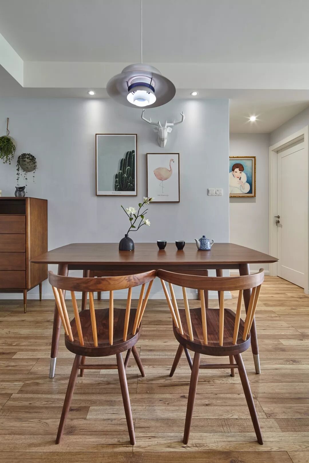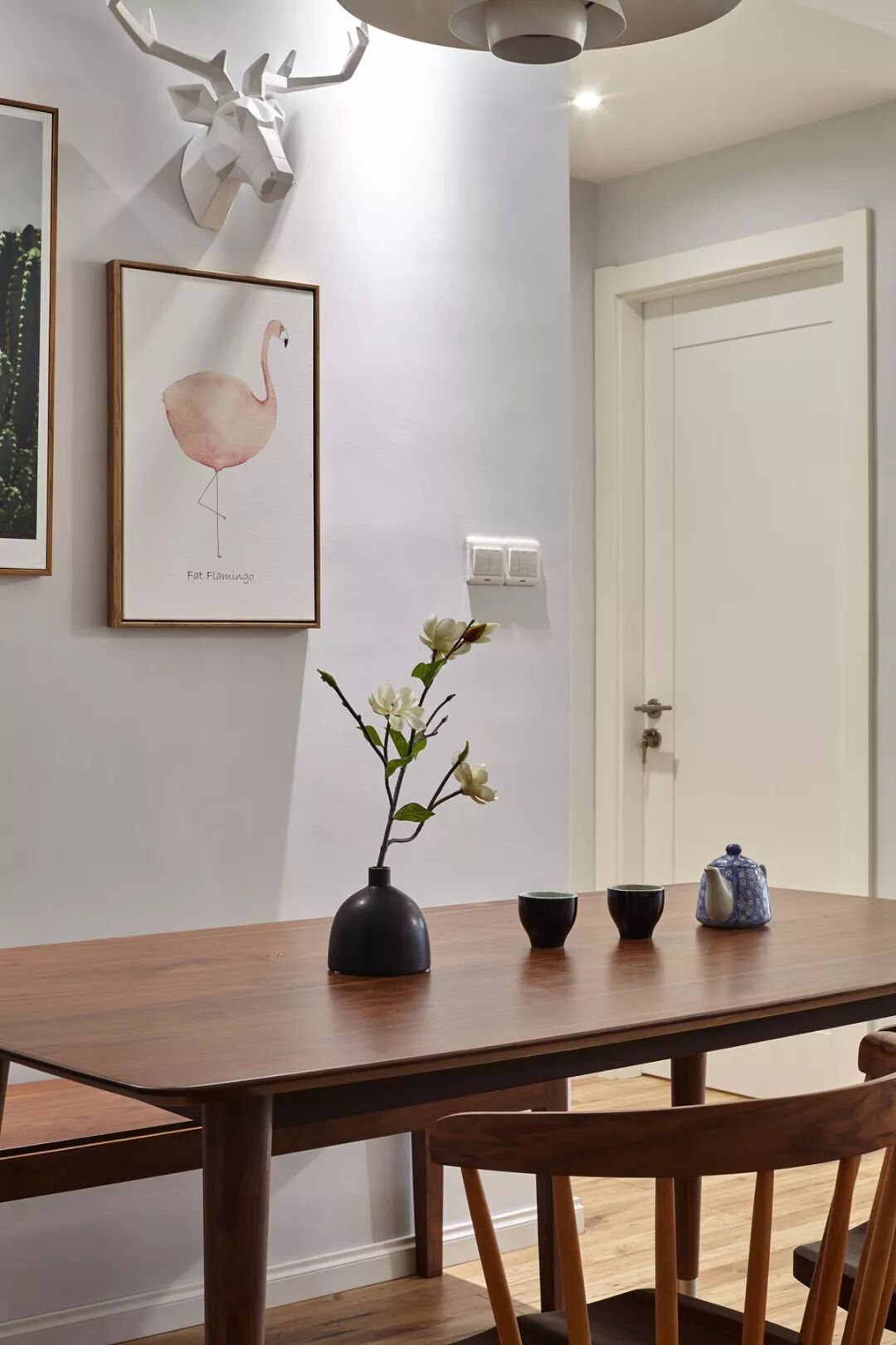 餐厅背景墙的鹿头与红鸟装饰画,结合木质餐桌上的禅意小花枝与一套小茶具,整个空间都显得好自然舒适。
