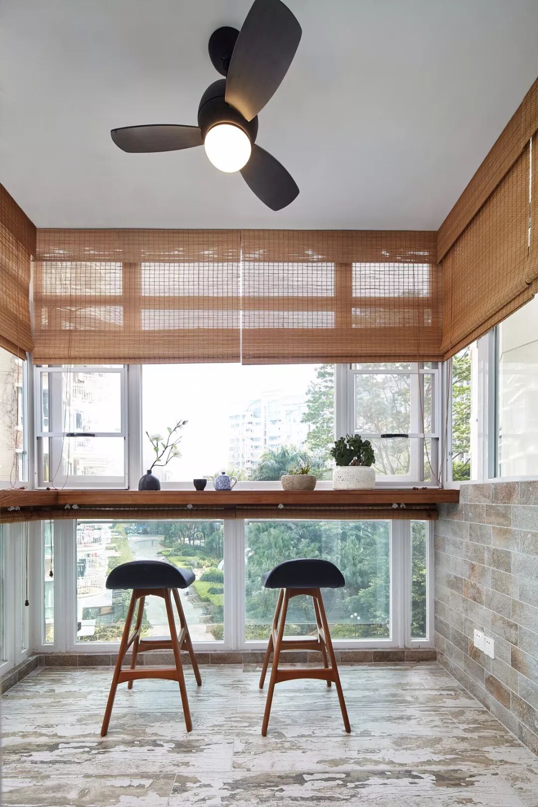 由阳台改造而成的阳光房,融入原木韵味的吧台、座椅、竹艺卷帘、灰色的吊扇灯等元素,在温馨舒适的阳光的衬托下,韵味应运而生。台面上绿色的植物点缀生机,小小的一寸阳光房,却又藏匿着一个小世界。
