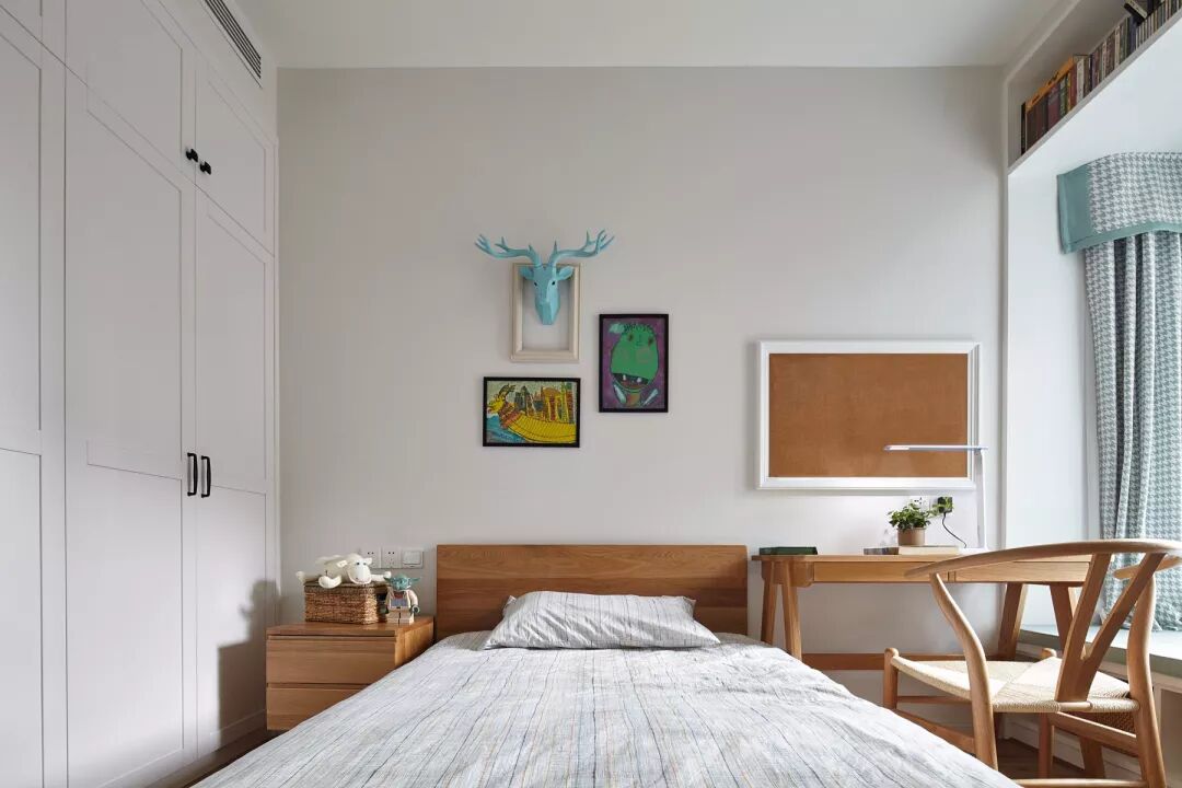 白色的打底空间,原木的韵味儿童房中,设计师别出心裁,利用小主人的原画作作为床头的挂饰,搭配北欧风的鹿头,充分显示了小主人的童趣风。