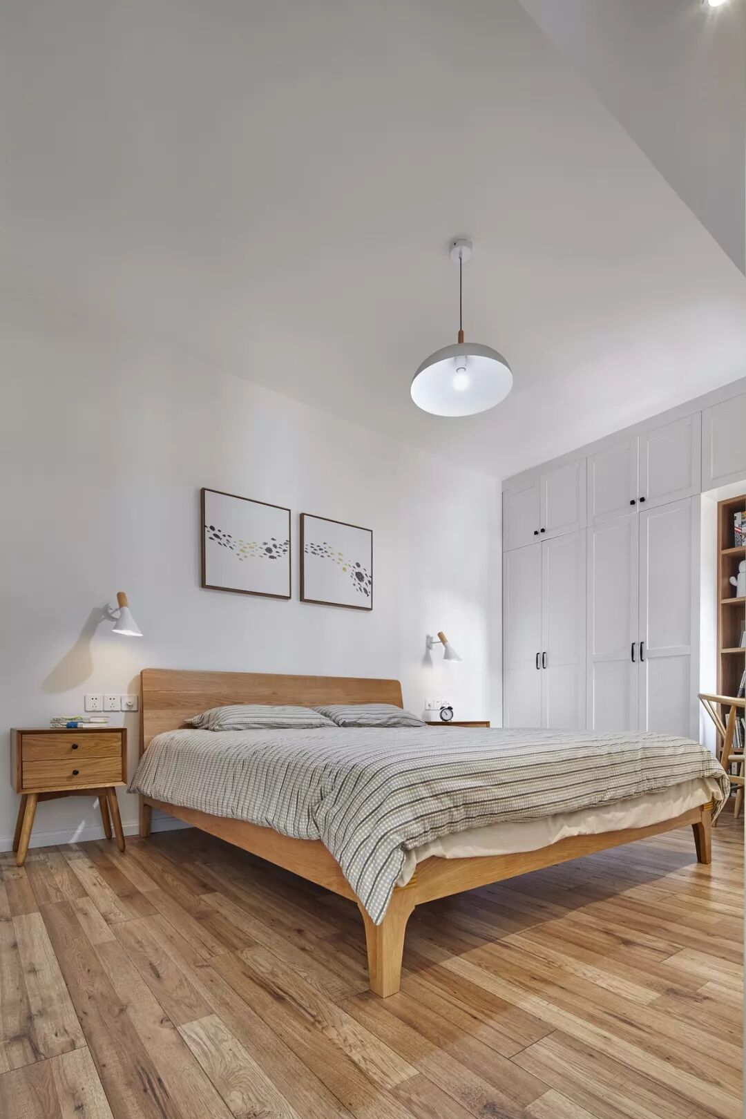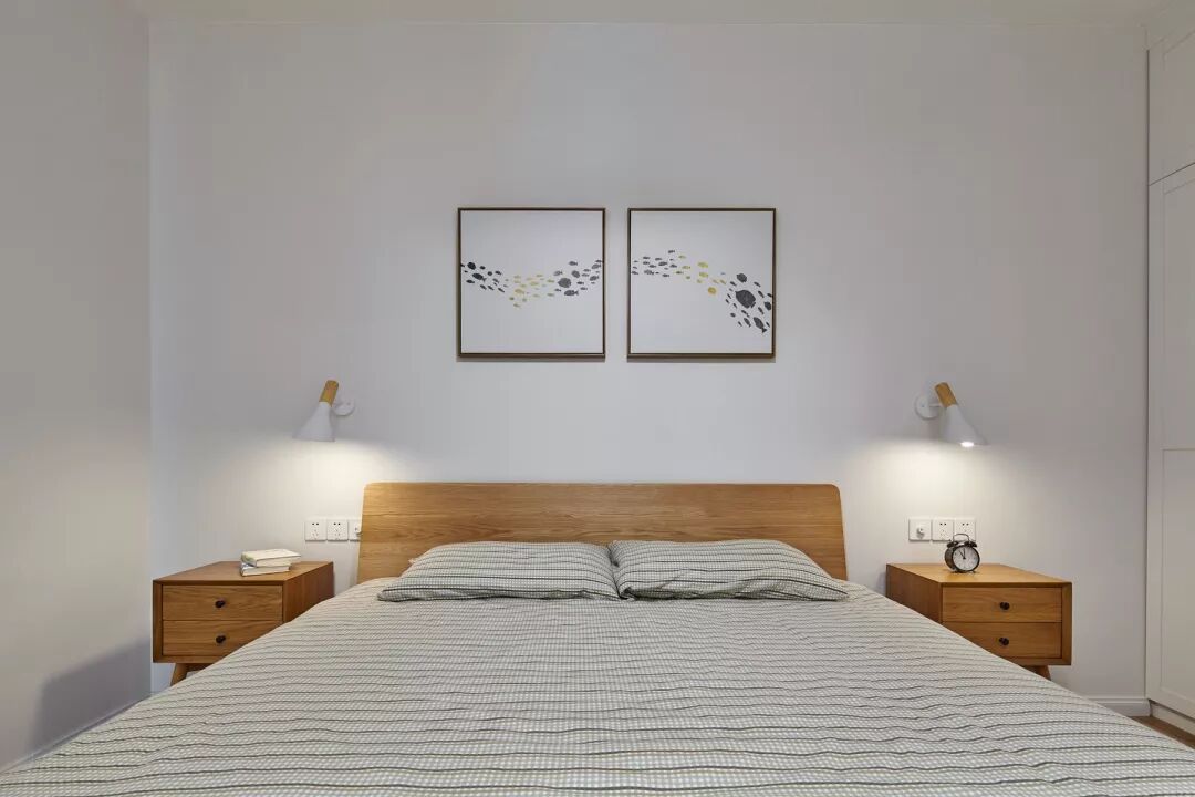 床头背景墙对称的装饰画与床头壁灯,还有原木质感的小床头柜,为这个简洁的卧室带来了几分自然与温馨的气息。