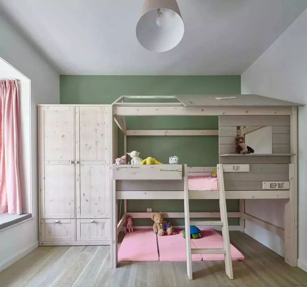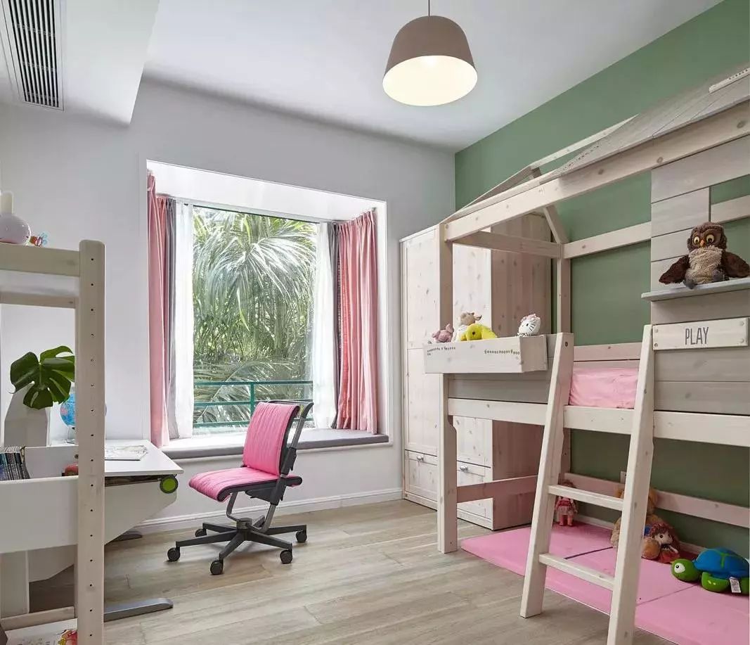 ▲儿童房原木与粉红色的搭配,看似简单却非常棒的设计,充满想象力、孩子有跟多的活动空间,还有个飘窗,窗边的学习区也非常赞。