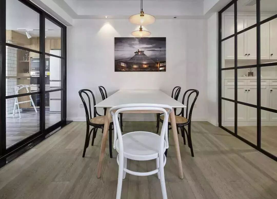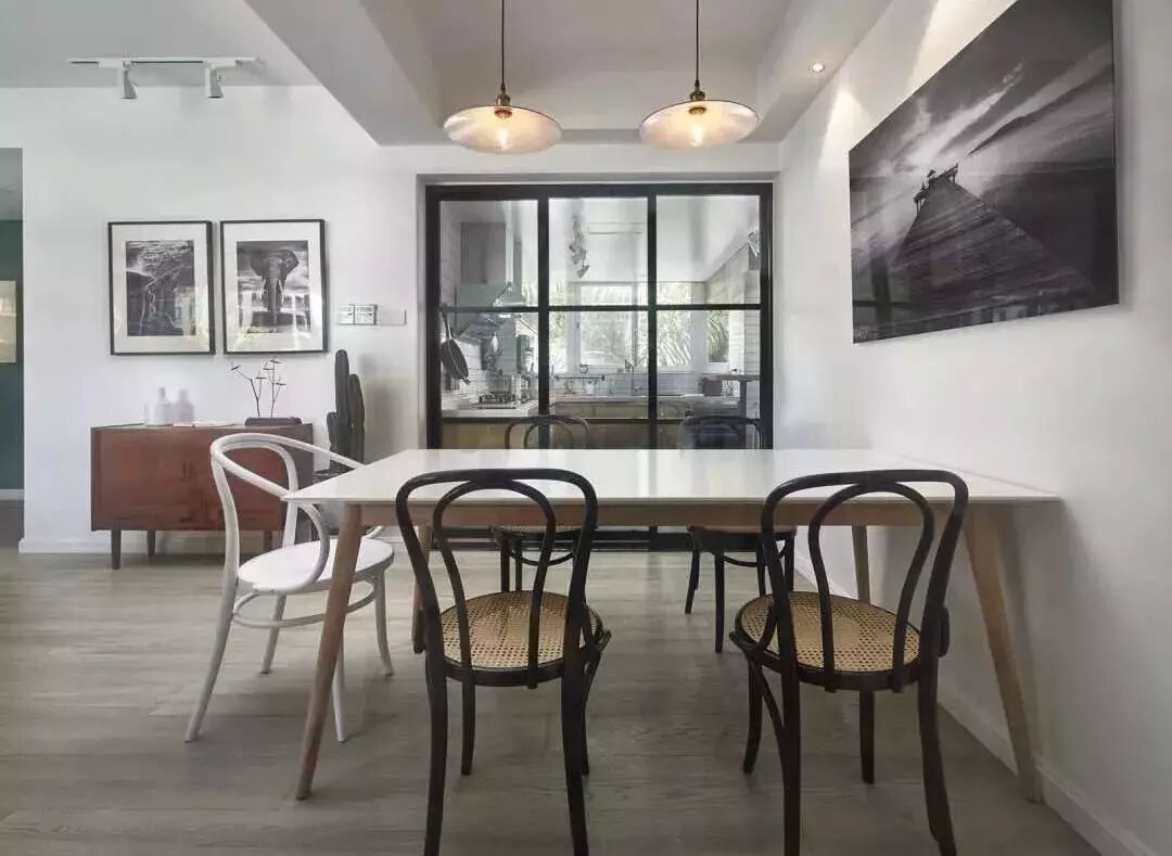 ▲开放式的餐厅,布置简单宽敞,吃饭的地方就该这样,与厨房也用了透明的玻璃隔断,视野更好、增强了互动性。
