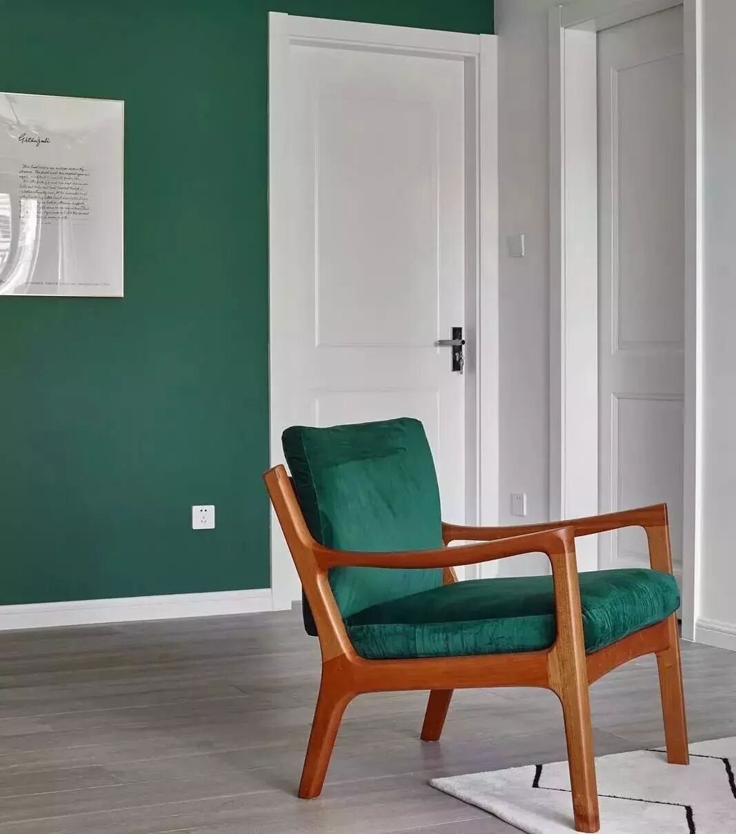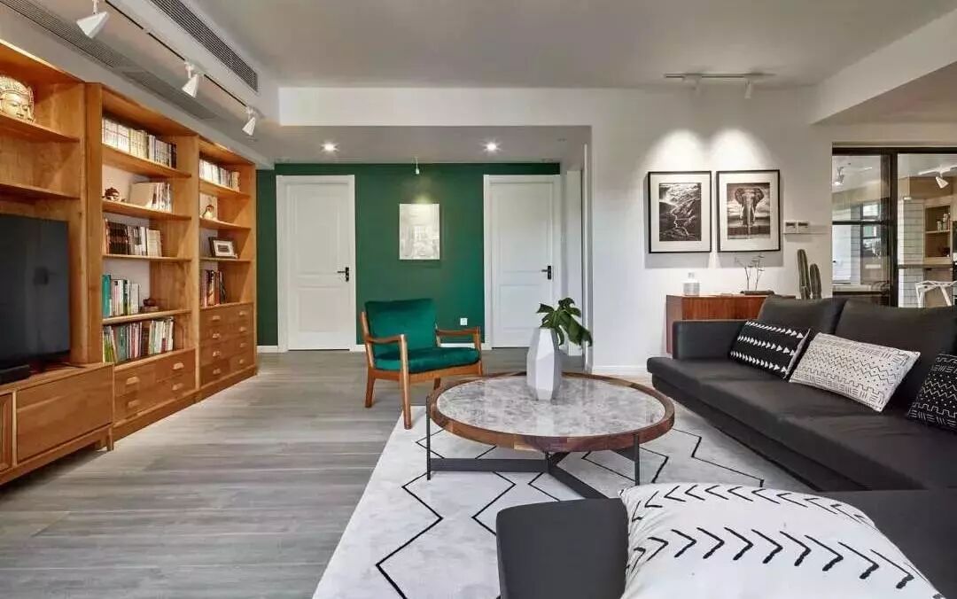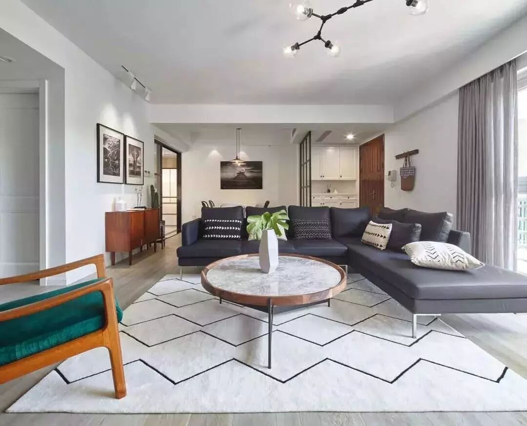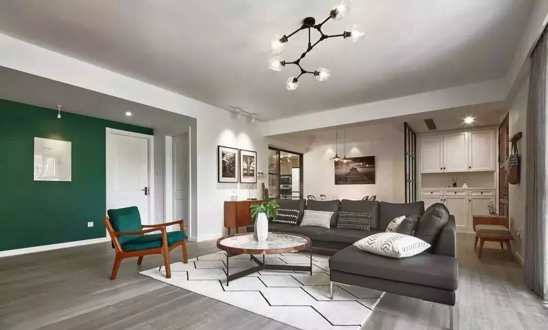 ▲客厅,现代工业风与北欧风格的混搭。高级灰、质感绿、纯净白还有金属与原木的混搭,看起来很时尚。地毯让空间看起来更具层次感。