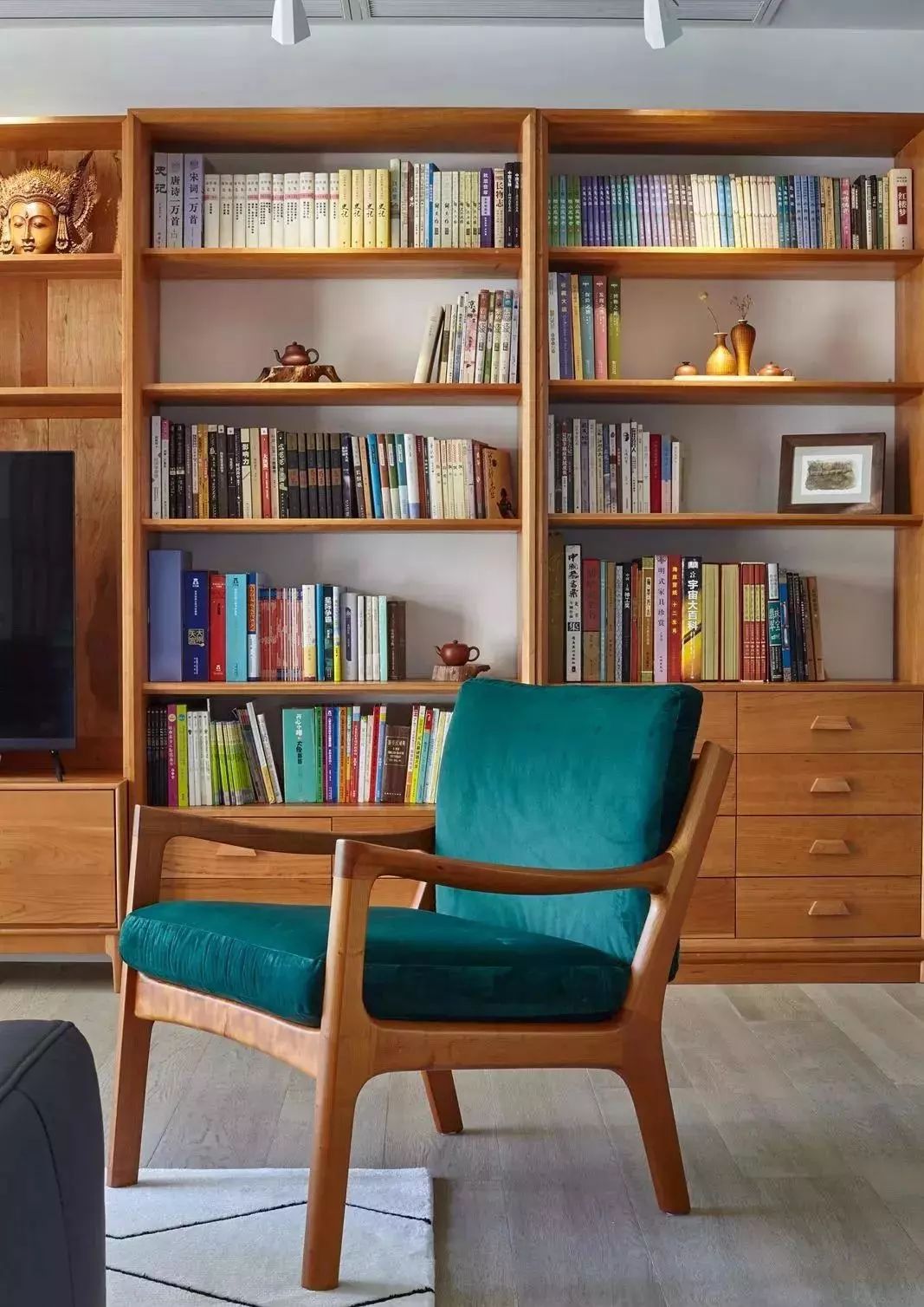 ▲用书柜作为电视背景墙,非常棒的设计,这样的原木书柜看起来非常不错。