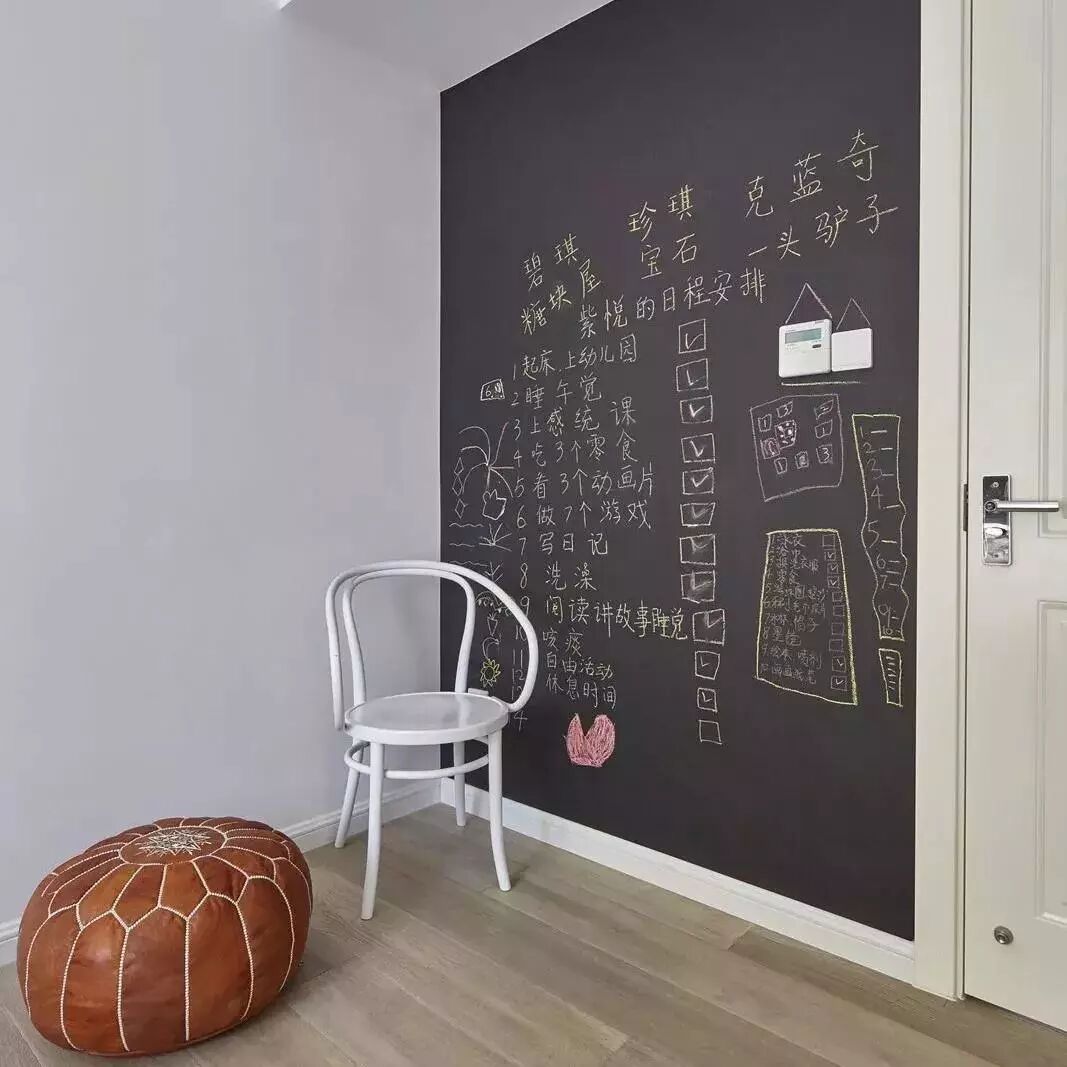 ▲休闲区设计了一面黑板墙,平时孩子可以在这里做学习计划,或者画画练字,都是极好的。摆上小椅子和懒人沙发,也是一个不错的阅读角。