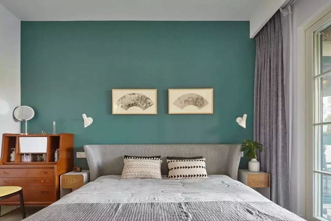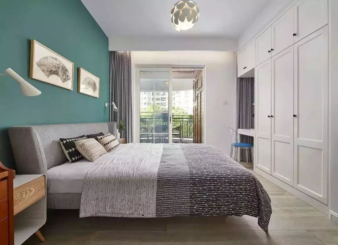 ▲主卧清新的绿色作为打底色,再加上浅灰的床品,深木色收纳柜,确实很温馨很舒适。大衣柜采用嵌入式结构,把小书桌融入其中,更省空间。