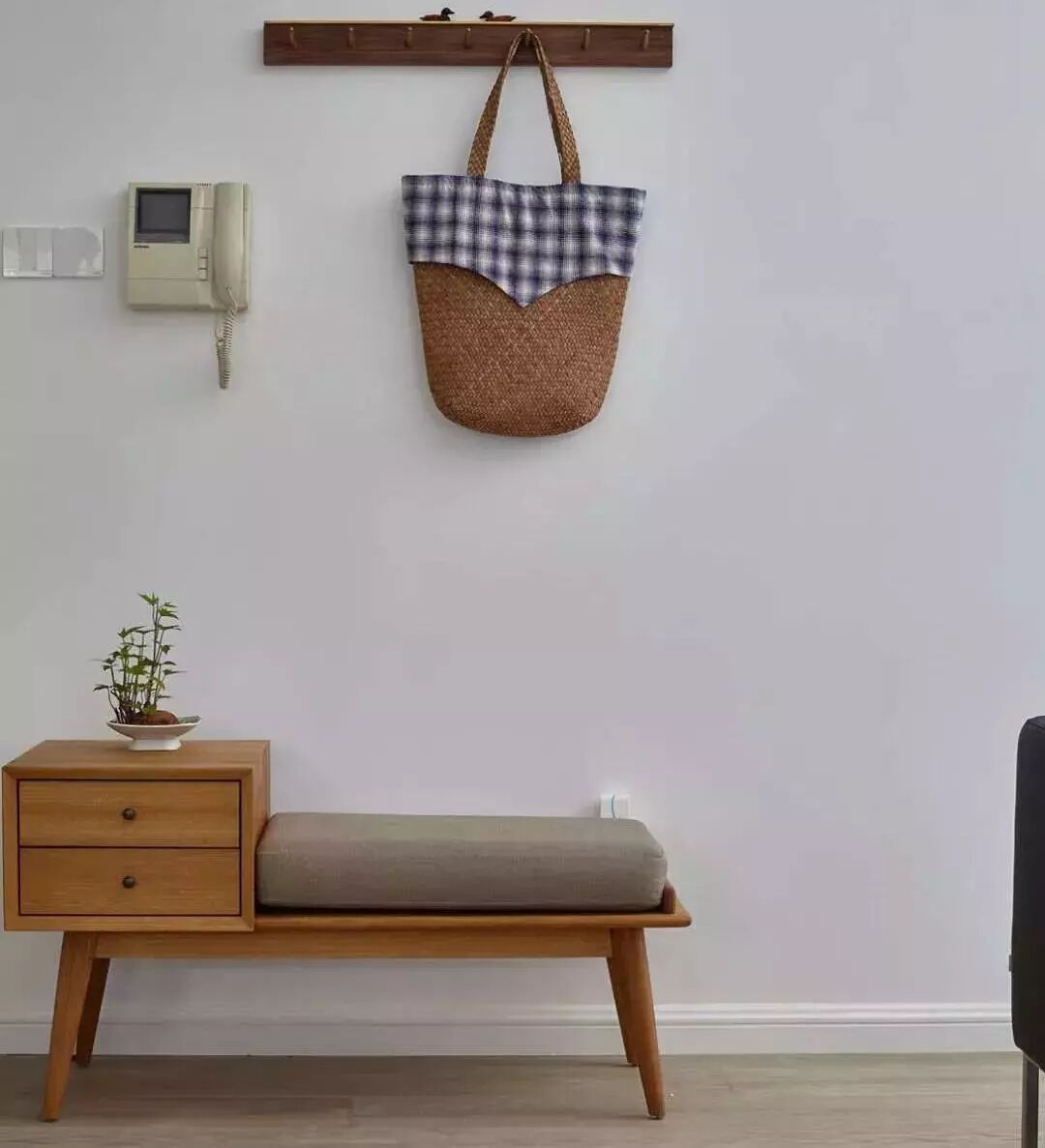 ▲小巧精致的原木换鞋凳和挂衣勾,看起来很清新。