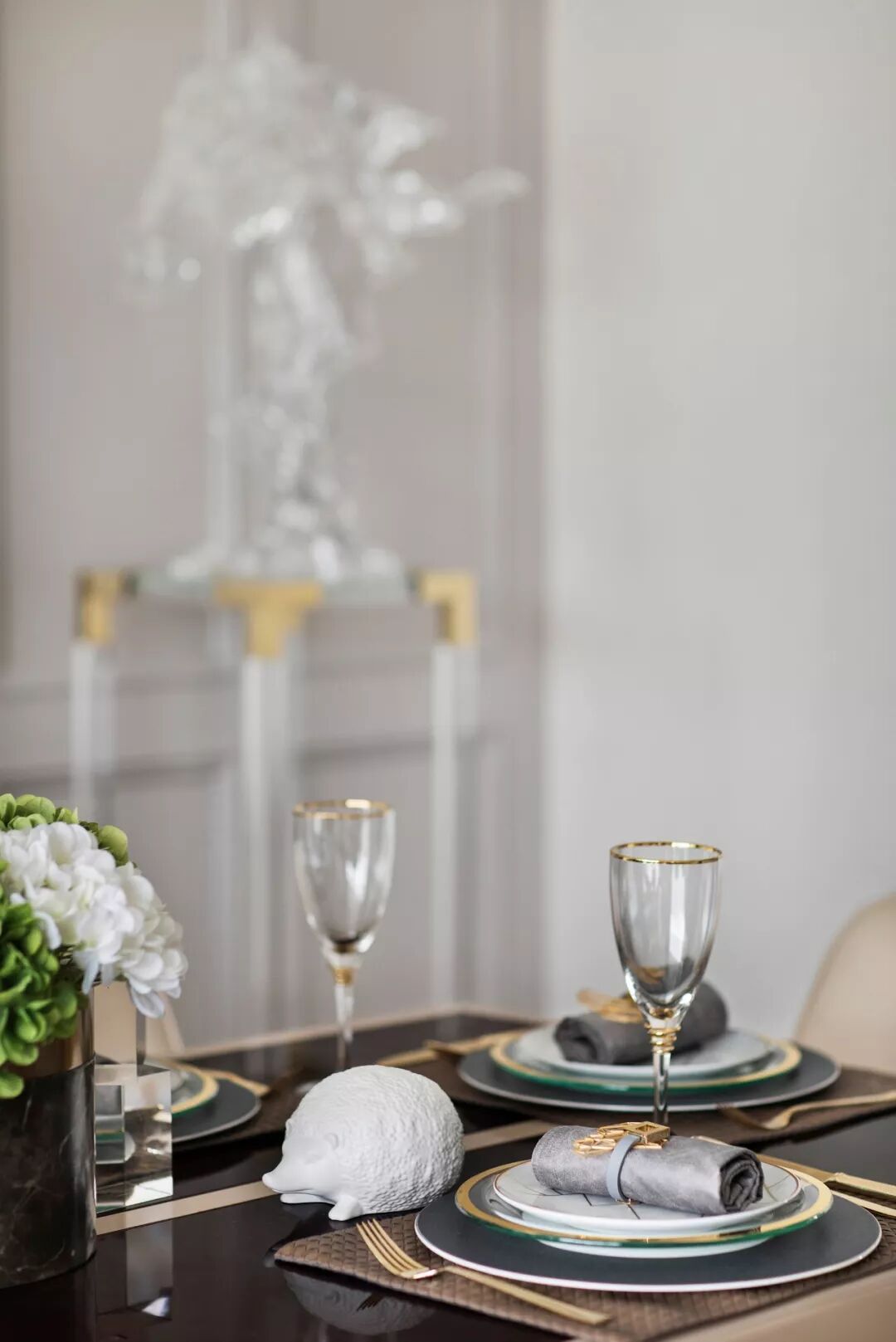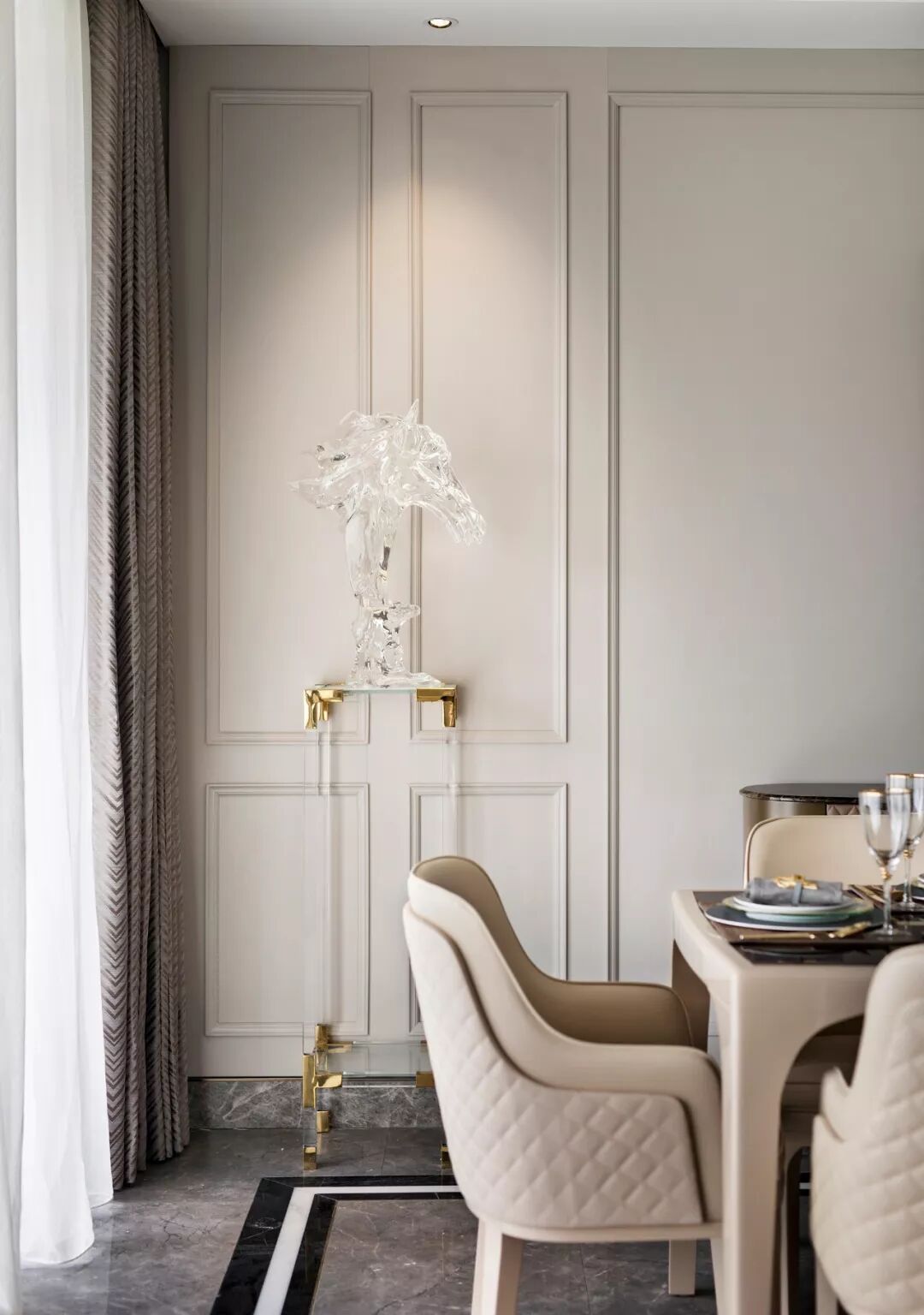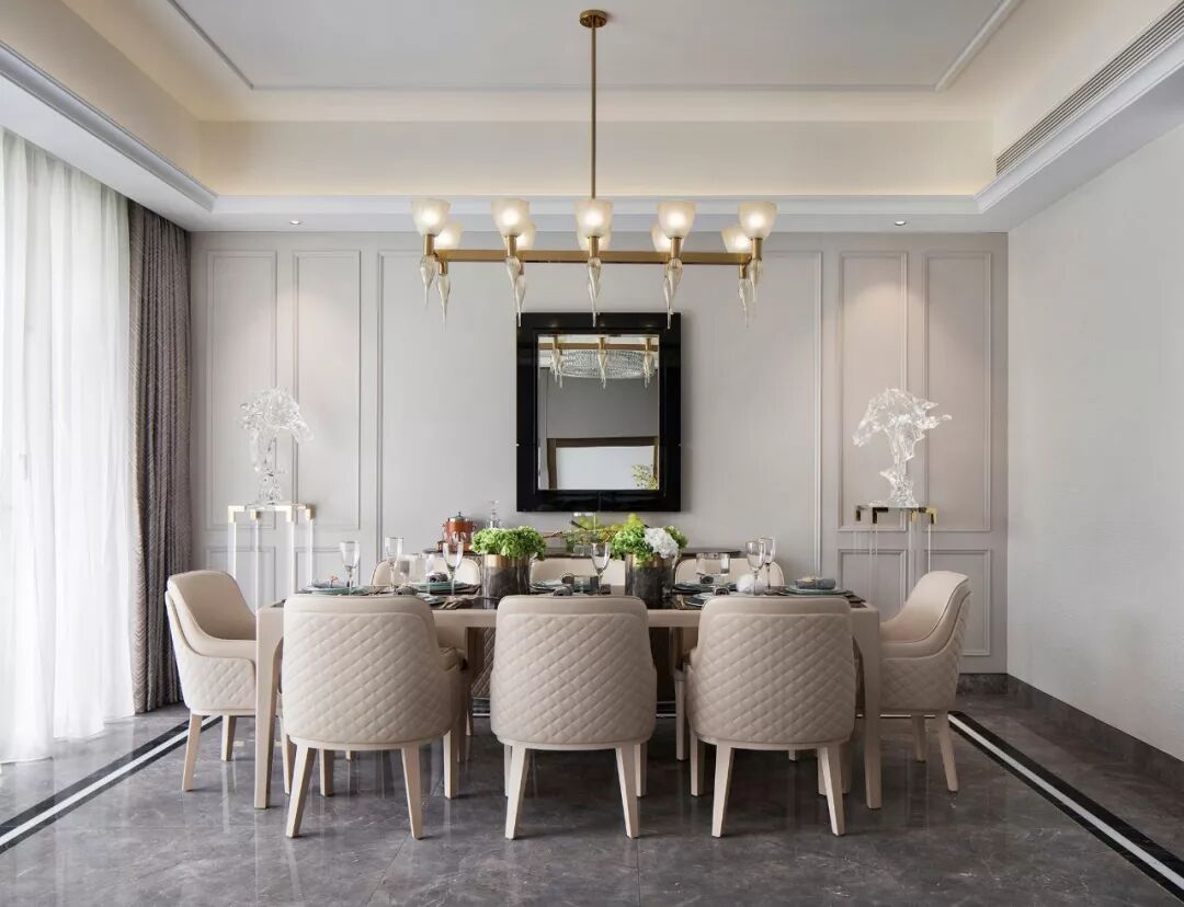 用餐区设计清雅现代,米白色的背景墙以简化的护墙板包裹,左右对称的极简线框,正置中央的黑边镜框,一组水晶造型飞马侍伴左右,共同营造出用餐的仪式美感,现代风的悠然轻灵和欧式的优雅美学于此共同发声。