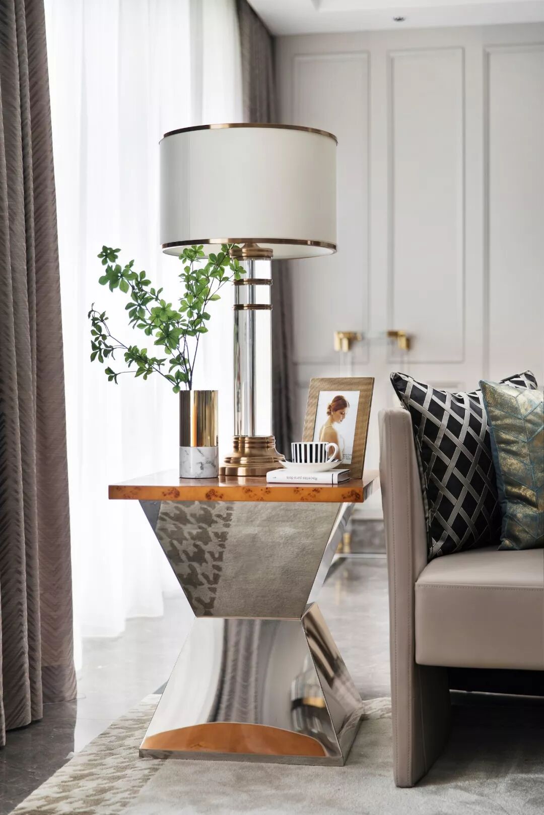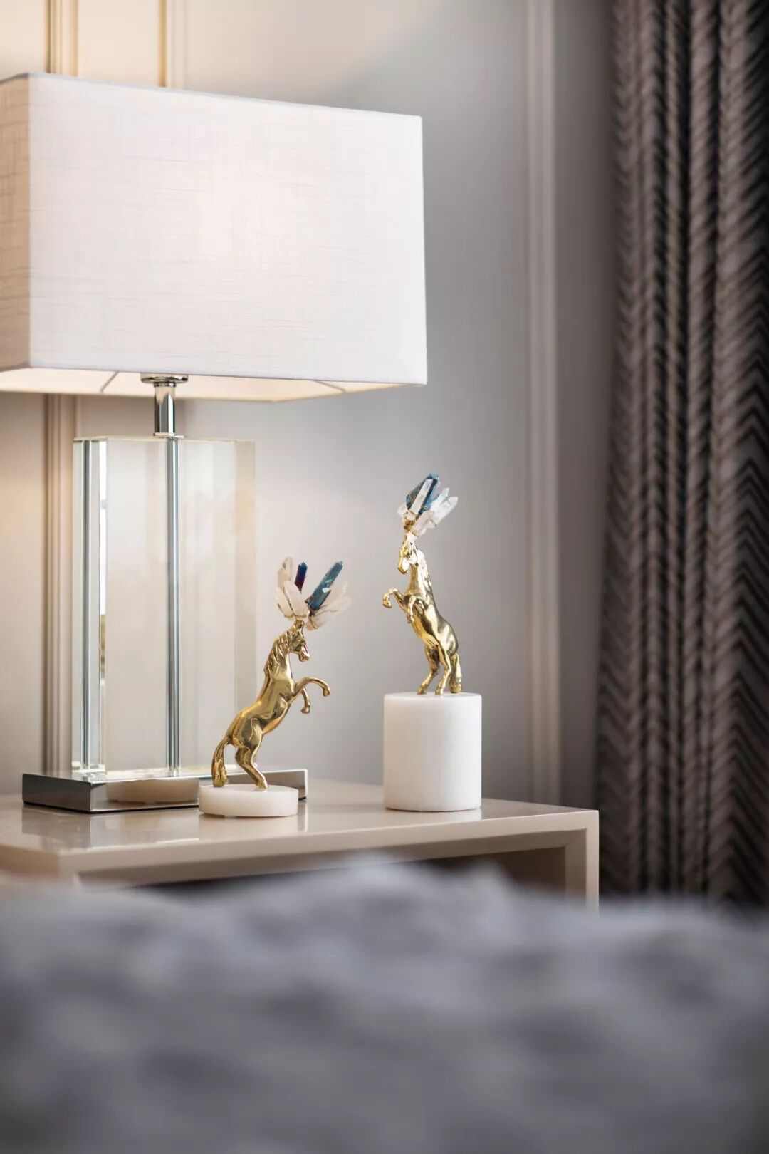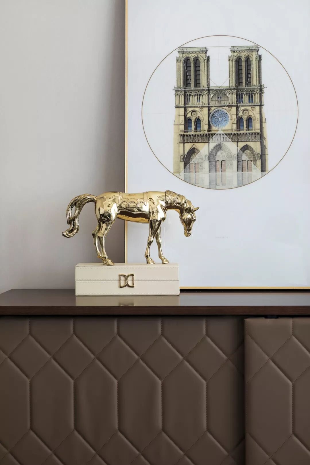 用餐区设计清雅现代,米白色的背景墙以简化的护墙板包裹,左右对称的极简线框,正置中央的黑边镜框,一组水晶造型飞马侍伴左右,共同营造出用餐的仪式美感,现代风的悠然轻灵和欧式的优雅美学于此共同发声。