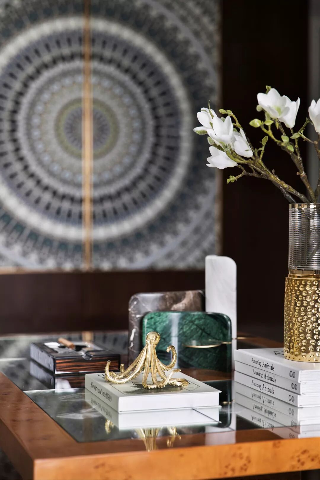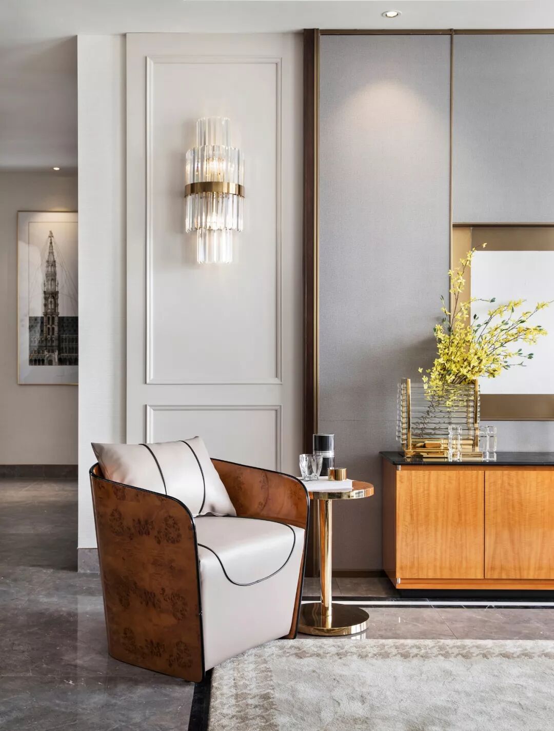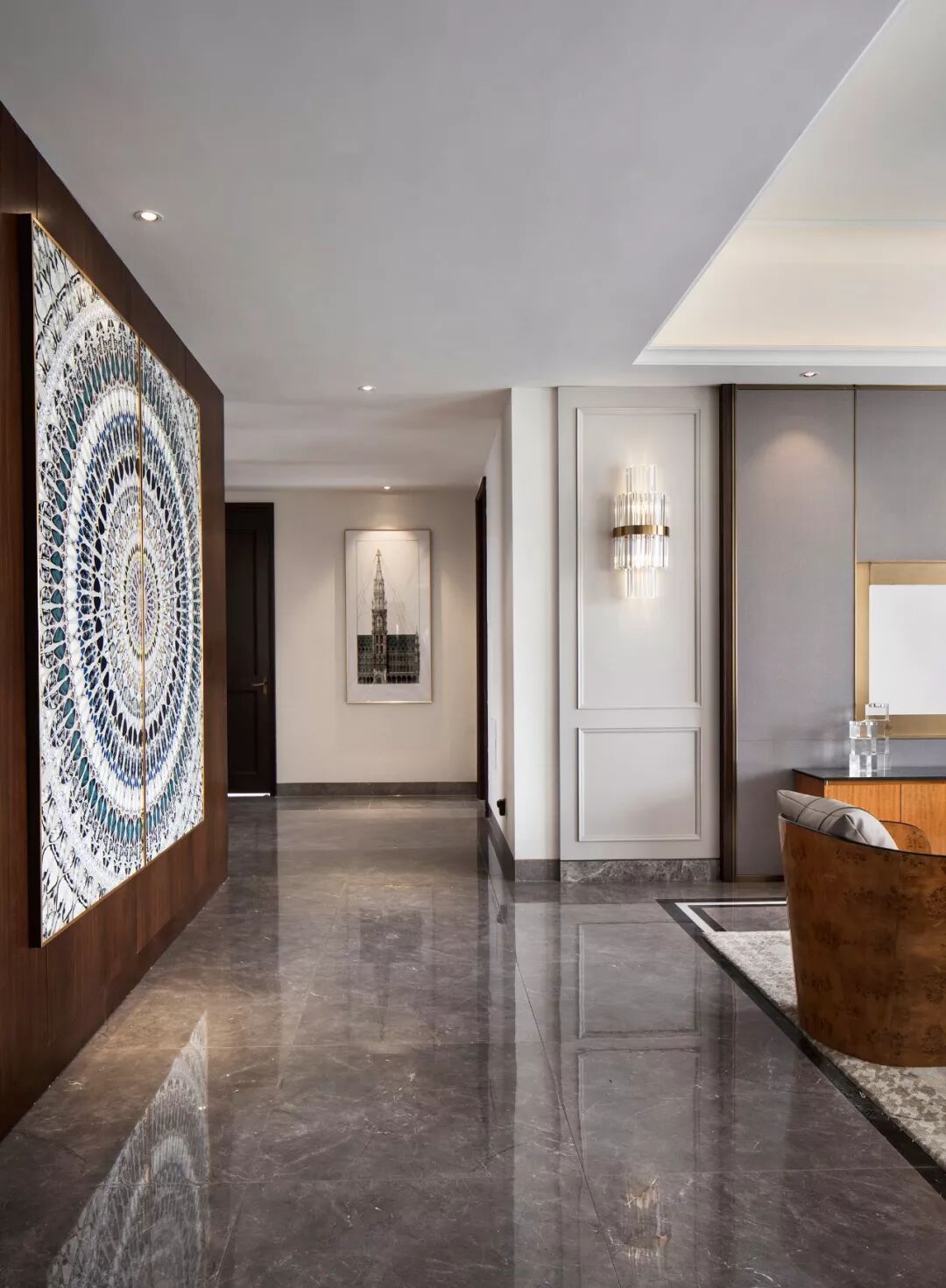 在整体明亮简约的浅色大空间中,过厅处一面棕色原木墙超脱出来,赋予了空间朗朗气度之美,设计师顺势而为,只以巨幅花纹装饰画装点其上,层层发散状的圆环花纹,神秘而富有张力,让空间更显气韵生动。