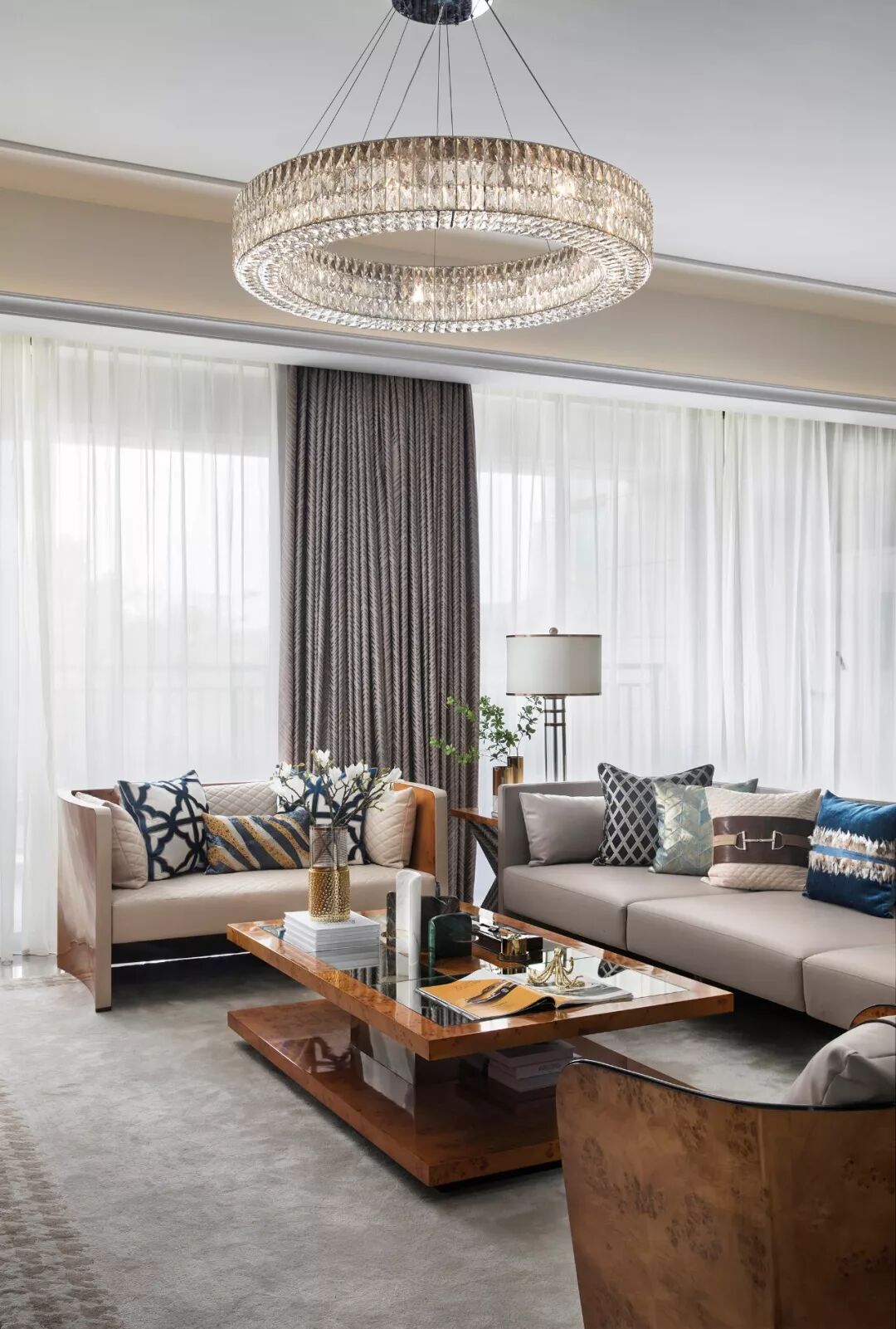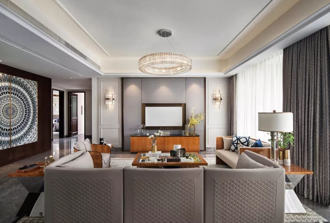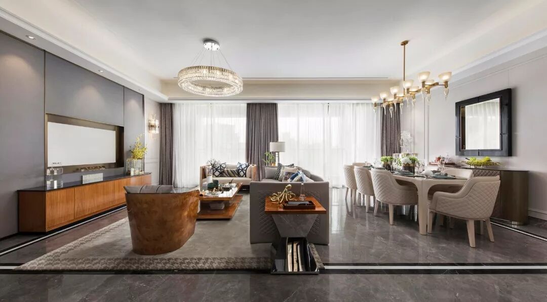 简约现代的空间线条勾勒出轻缓的文化氛围,雨花灰色的大理石地板与白色搭配,让高级感和清透感同时凝炼表达,设计师巧妙地融入了今年最新的流行色——暖木棕,这种色彩穿梭在高级时尚与自然大地之间,赋予轻奢优雅更新的生命气息。