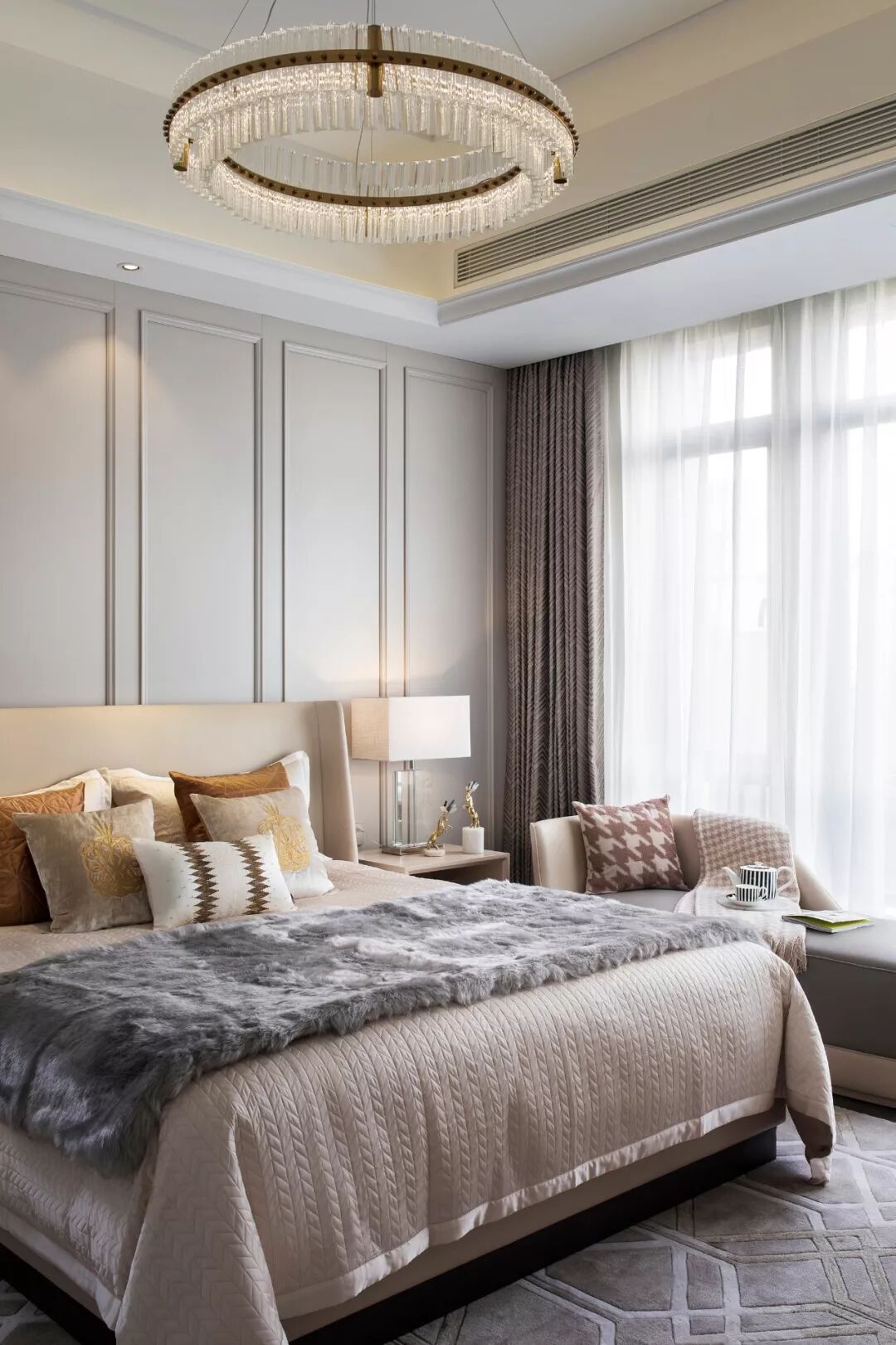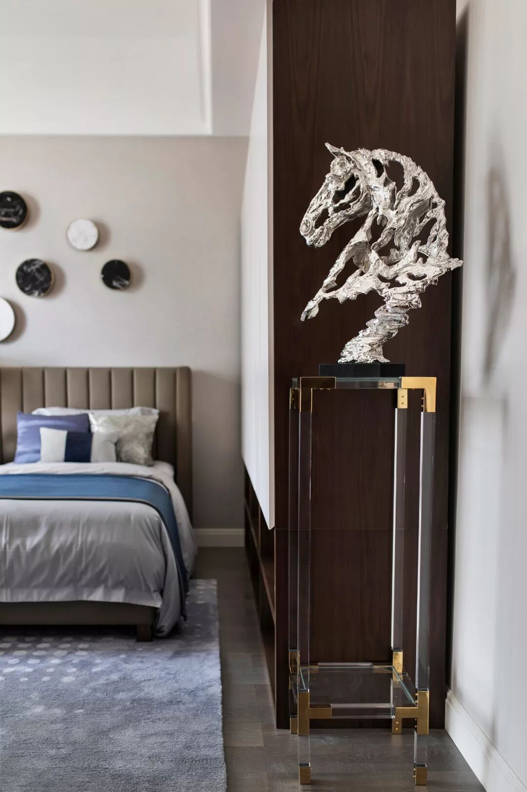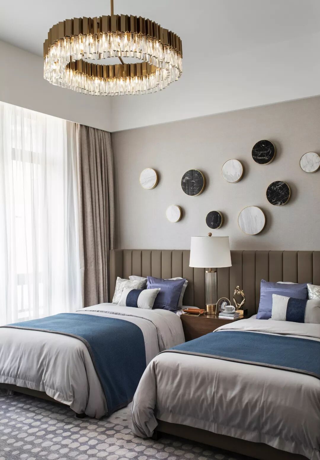老人房为高级酒店式的双人床大开间,设计关照老人的深度交流与更优质的睡眠,整体环境清爽且稳重,圆形黑白大理石艺术装饰画与灰色地毯上的白色圆点花纹互相呼应,中性偏柔和的空间中,一抹深幽的蓝色具有平衡的作用,安静又宁谧。