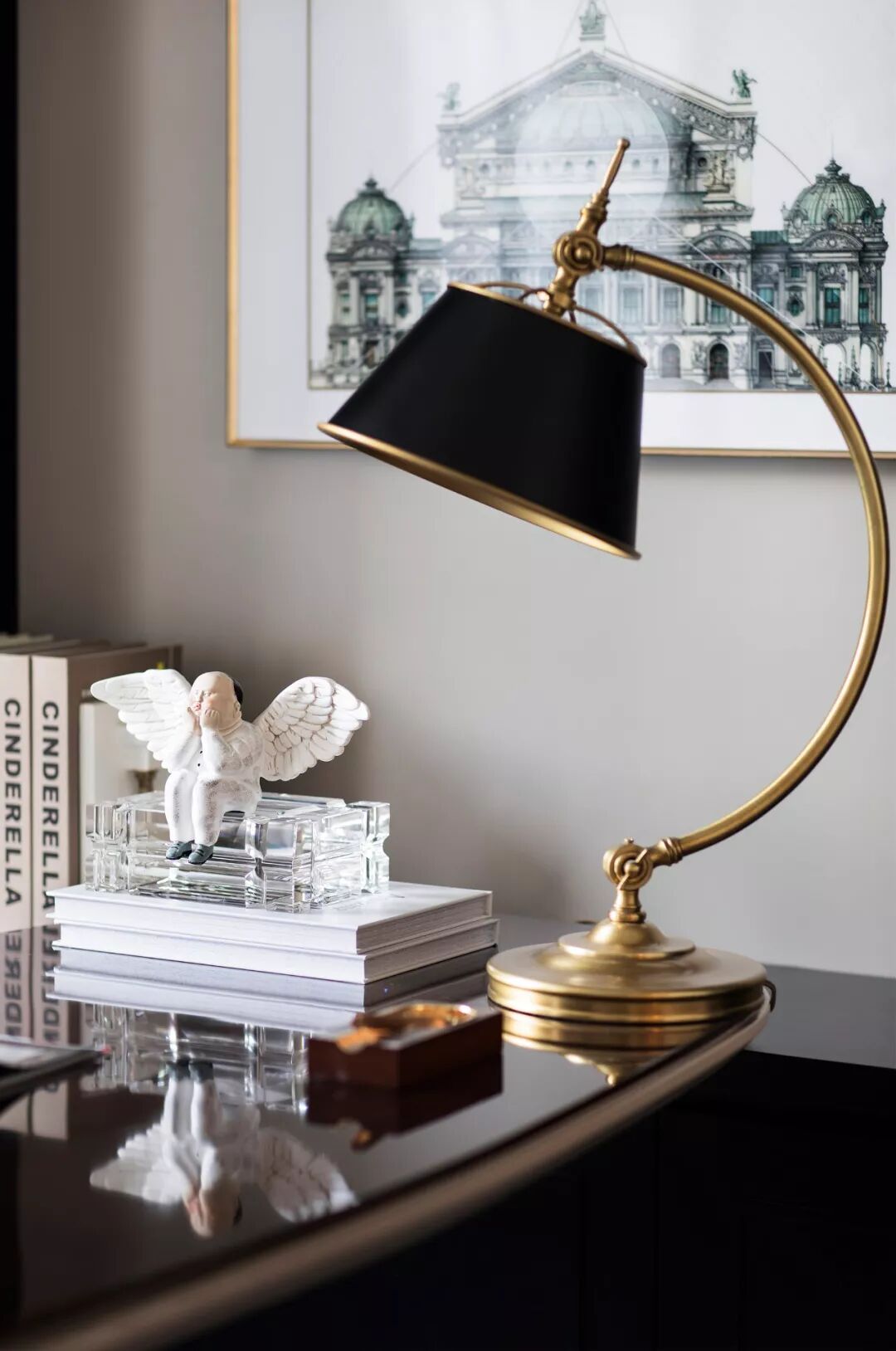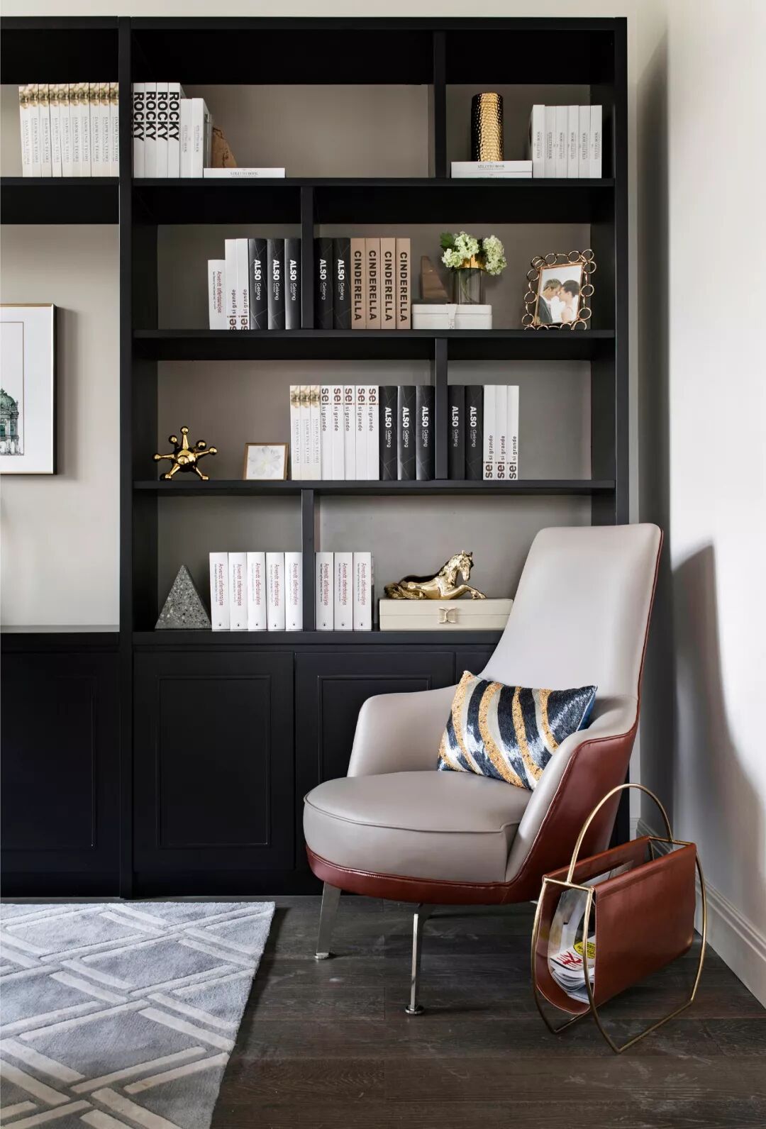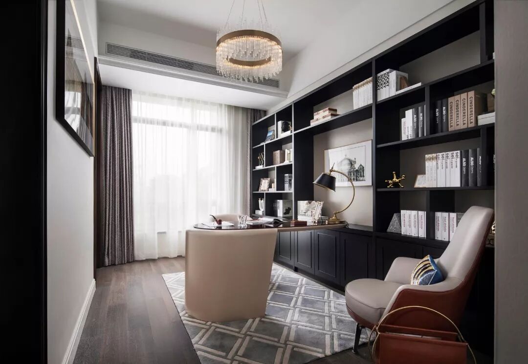 书房设计简约高雅、舒心别致。黑漆书柜铺满整面墙,典雅大气,不经意间释放出理性化的气场与高贵的气息。几何纹路的灰色羊毛地毯,带有一丝高贵的英伦气质,作为过渡色让空间韵律连贯起来。