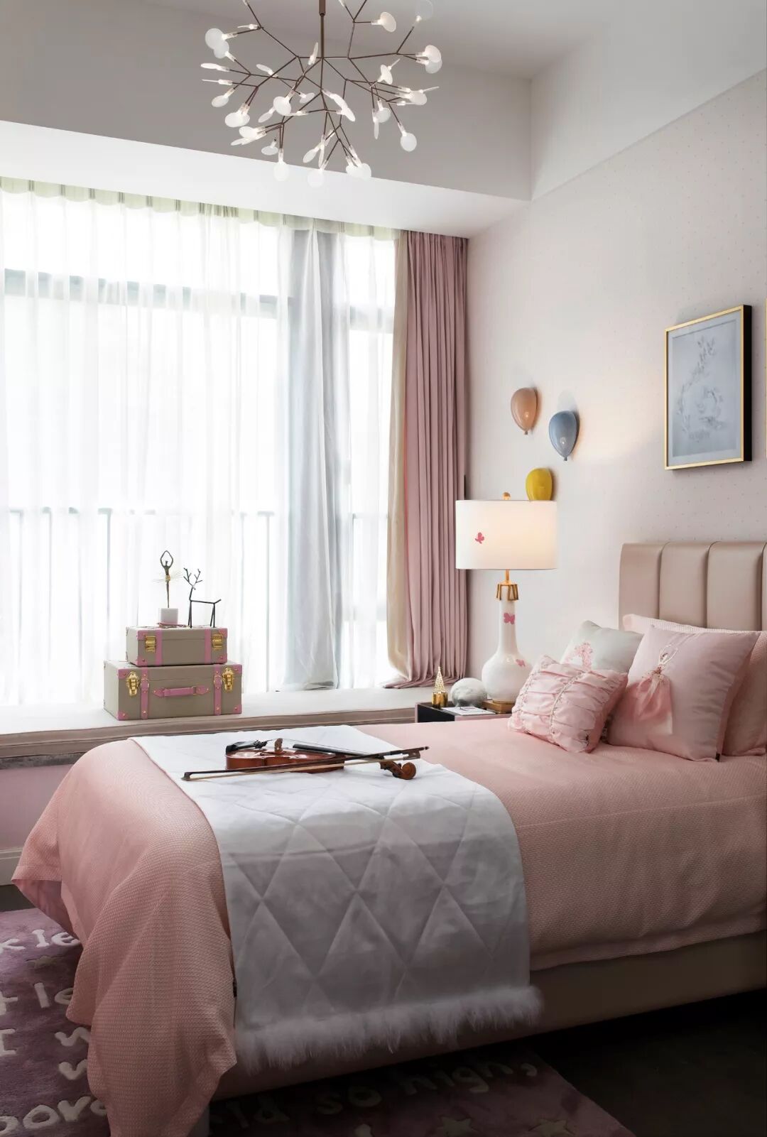 女孩房以浅浅的烟粉色和橘粉色为主色,没有主流粉色的甜腻,却多了一丝阳光和温馨。整个空间弥散着清安、快乐的气息。充满艺术气质的芭蕾舞元素装点,给人带来一份直抵心灵的美好。