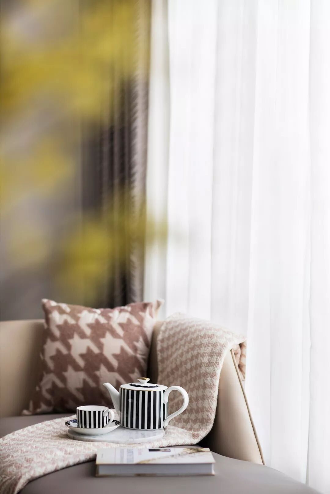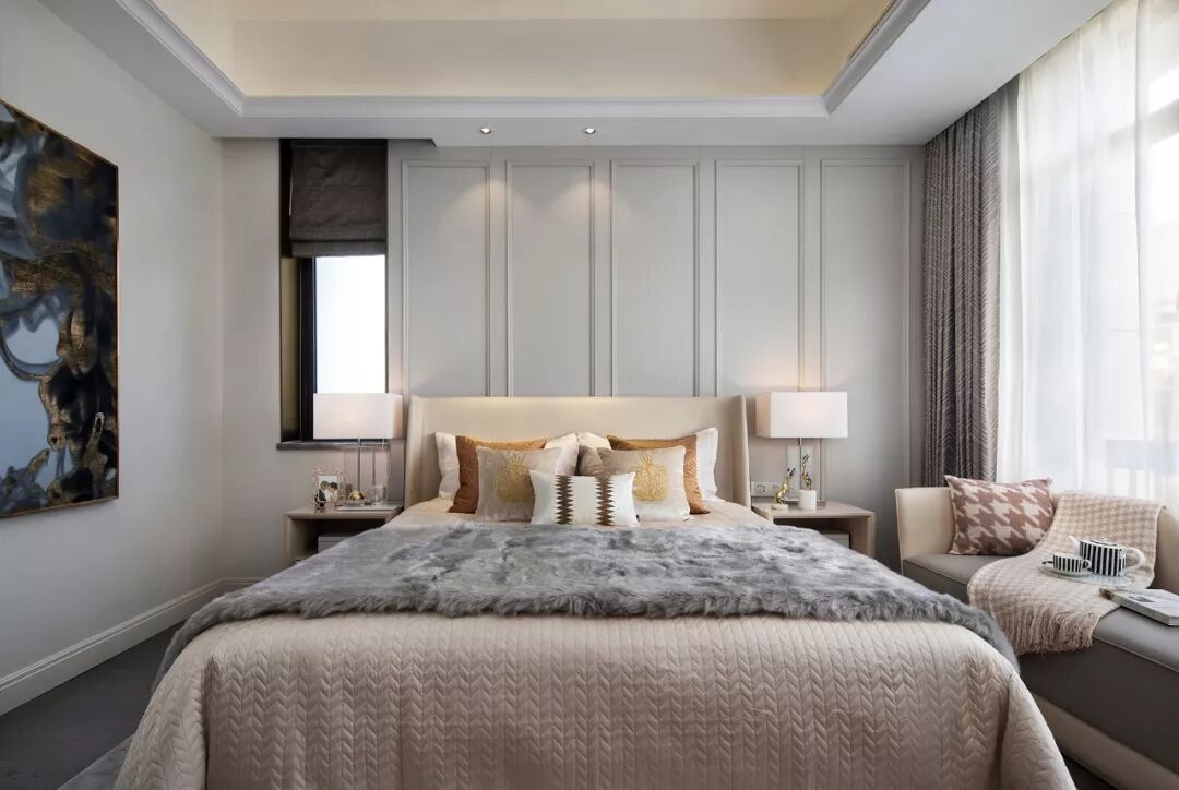 主卧设计温馨柔和,简洁的空间承接着煦和的自然光线,清浅的米色与白色交织,如絮般的温柔,如和风般的轻软,似乎具有抚慰人心的治愈效果。好的设计正在于细致的体验感受,而不只流于精彩视觉效果。