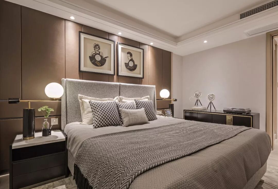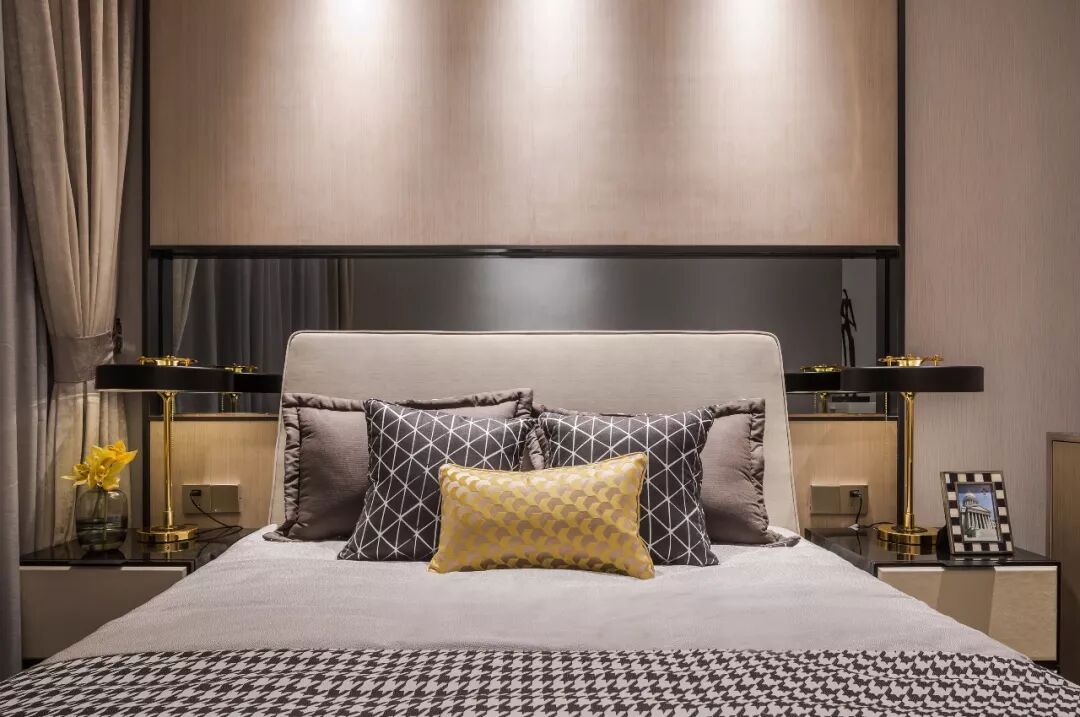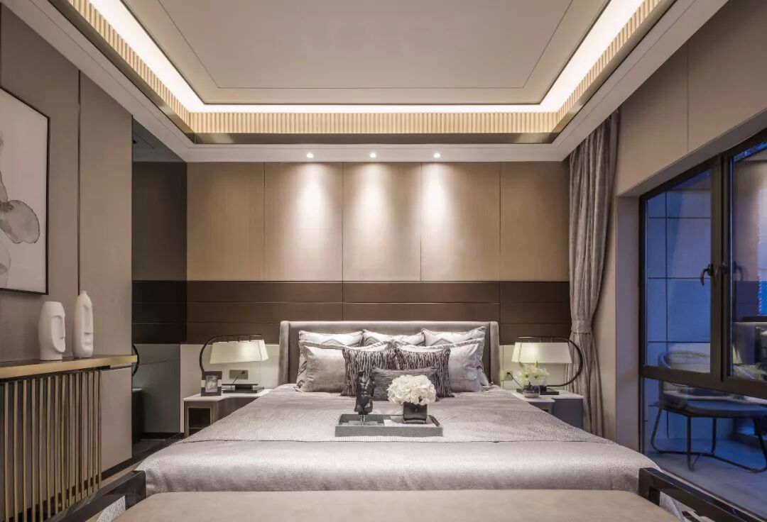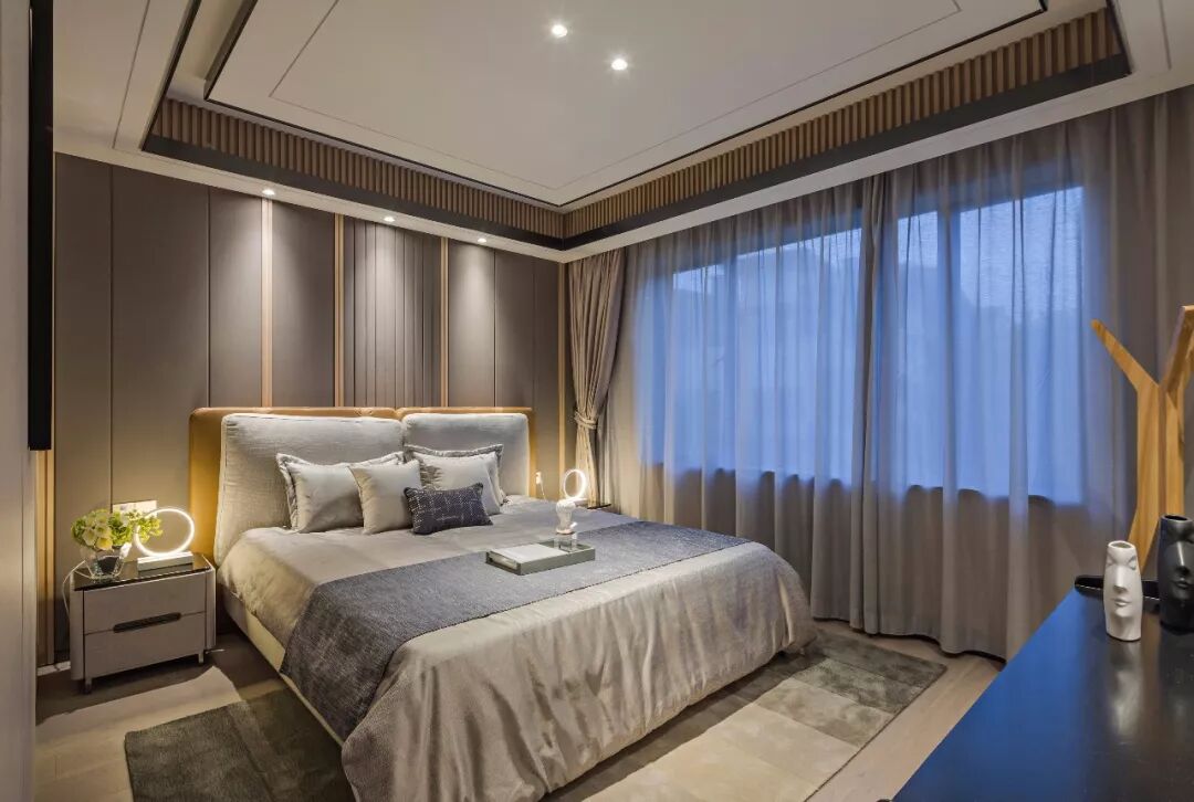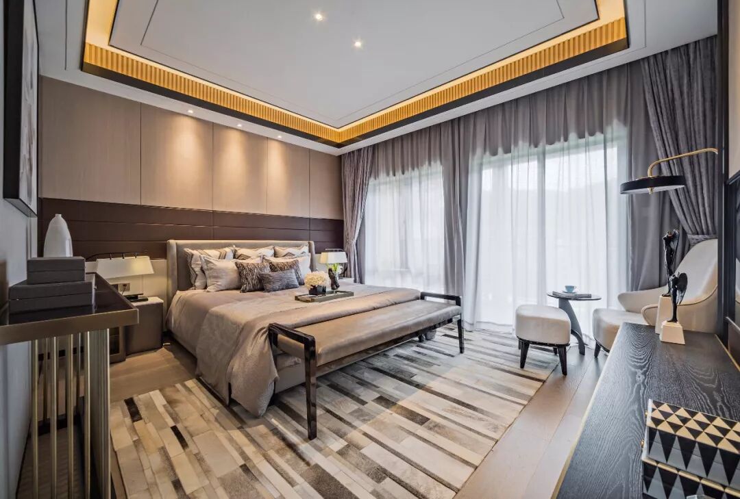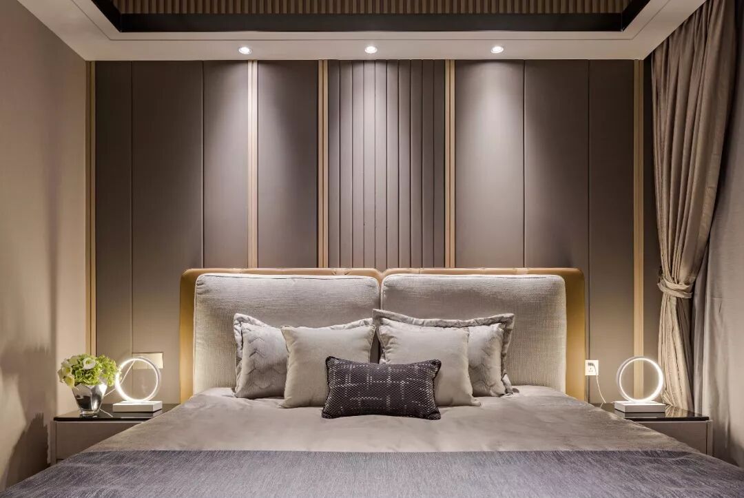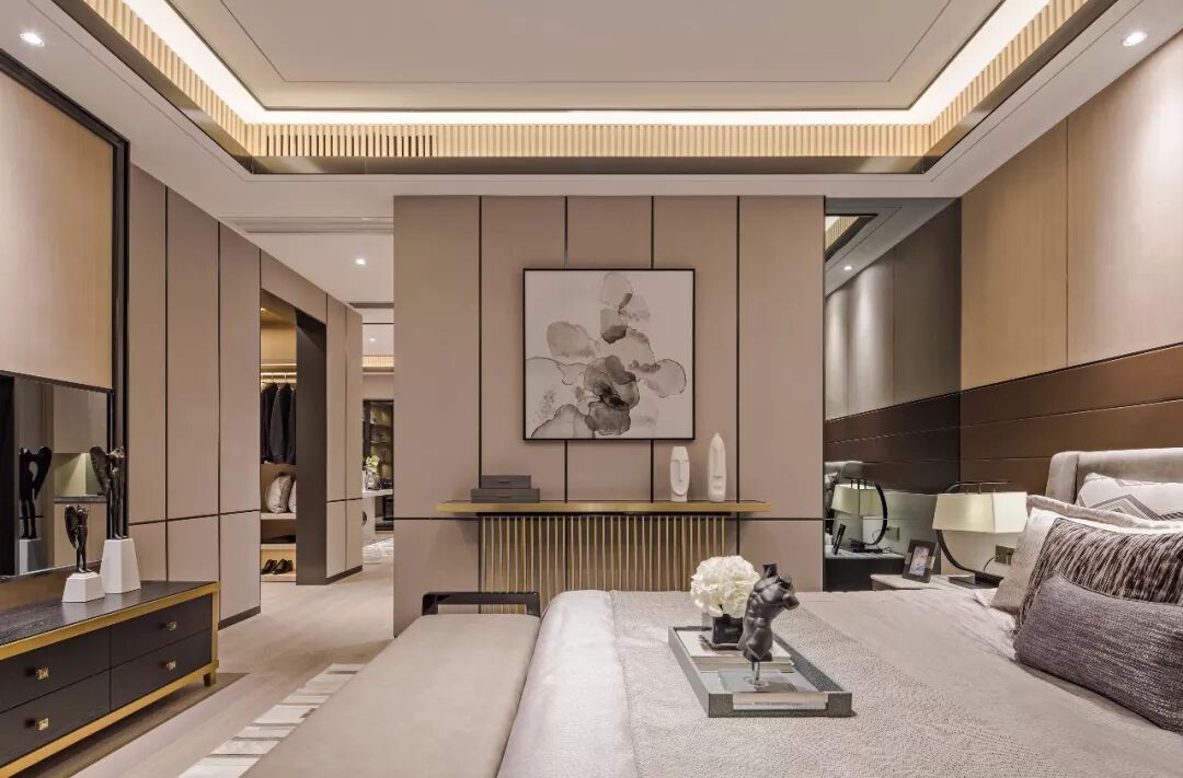 主人房采用柔和的灯光,让整体空间更舒适,开阔,金属的质感特显高贵时尚,整体空间色调柔和、美好,淡淡的光晕下烘托出温馨的氛围,色调淡雅,简约大气的家具线条在柔和灯光的衬托下,勾勒出时尚简约的空间氛围。