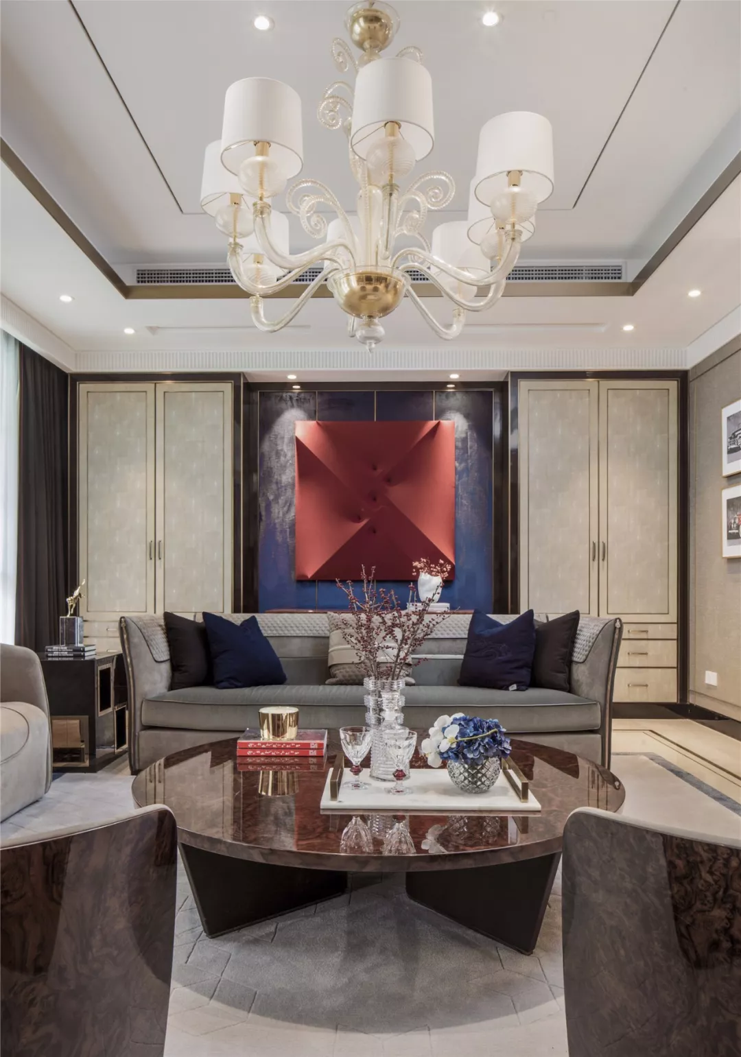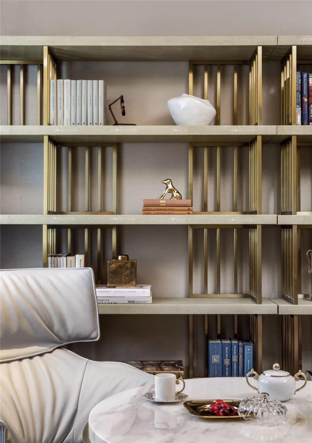 客厅墙面采用浅米灰色的真丝墙布,用书柜结合壁炉的方式做了主立面,采用水墨玉石材、珍珠鱼皮作为柜门饰面,使用原始状态呈现的材料,更能真实诠释原料的细腻性。同时以深色的高光木饰面,与卡其色系沙发微妙转承,形成高雅且沉稳空间之感。