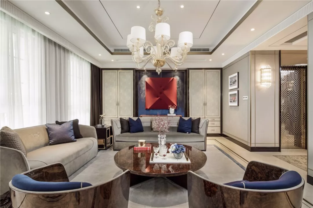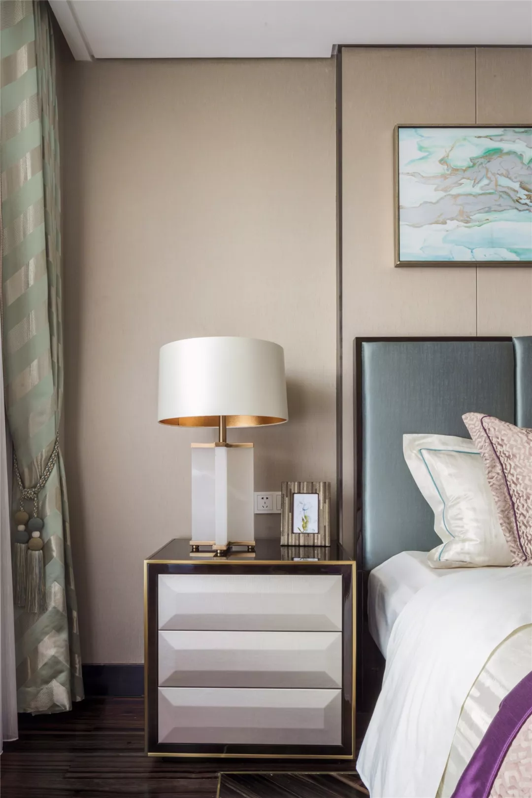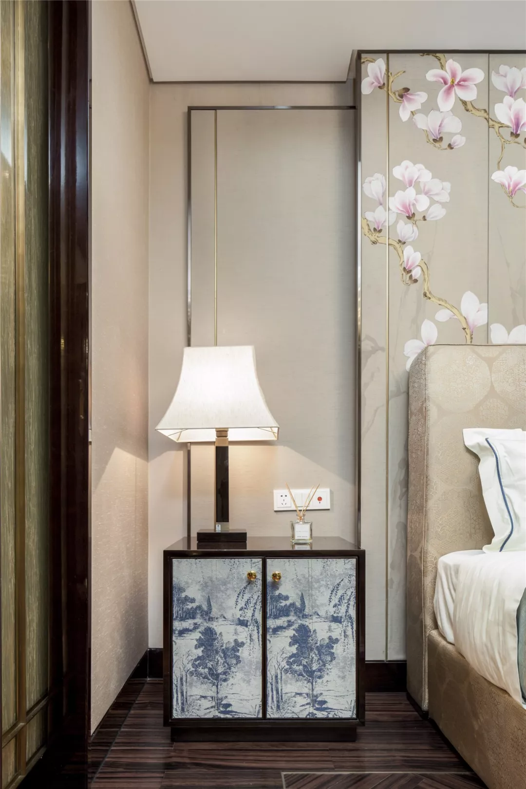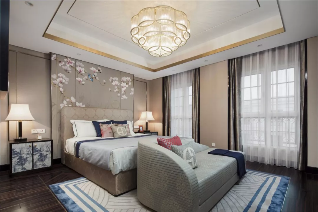 主人套房选择的家具和面料,凸显了强烈的中式元素,大面的暖灰色,用局部青花蓝色和朱砂红色,利用视觉反差的冲击,巧妙区分睡眠区和活动区,令生活的实用性,和对设计风格的追求,同时得到了满足。
