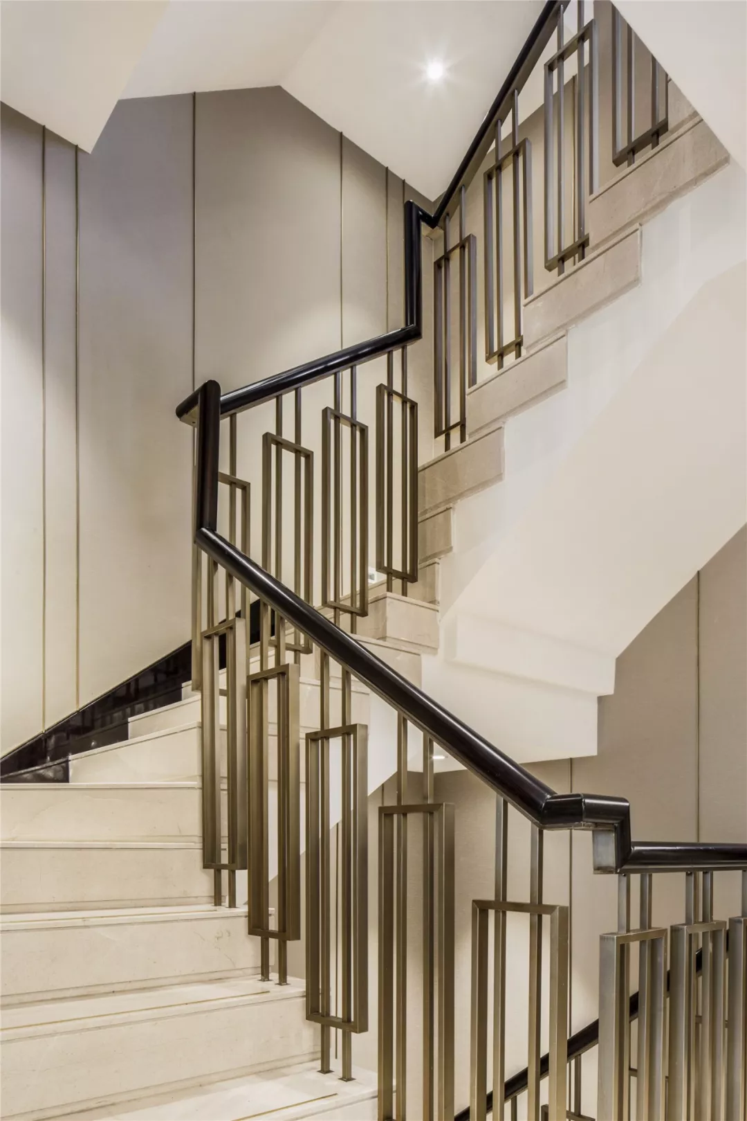通过强化楼梯形态的序列性,打造出曲中带直的节奏及过度,结合负一层楼梯尽头点缀的雕塑艺术,以此来减弱原建筑楼梯结构凌乱等问题。