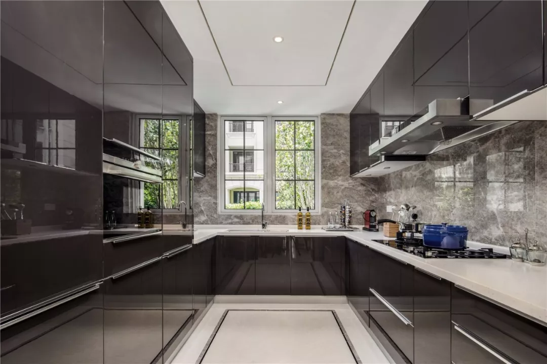 材料的搭配上,不论是局部选用的深高光木饰面,还是金属自然显露的流畅线条,都给人一种宁静致远的感觉,另有富于西方韵味的大理石与其搭配,又于无形之中增加了一种现代的干净气质。