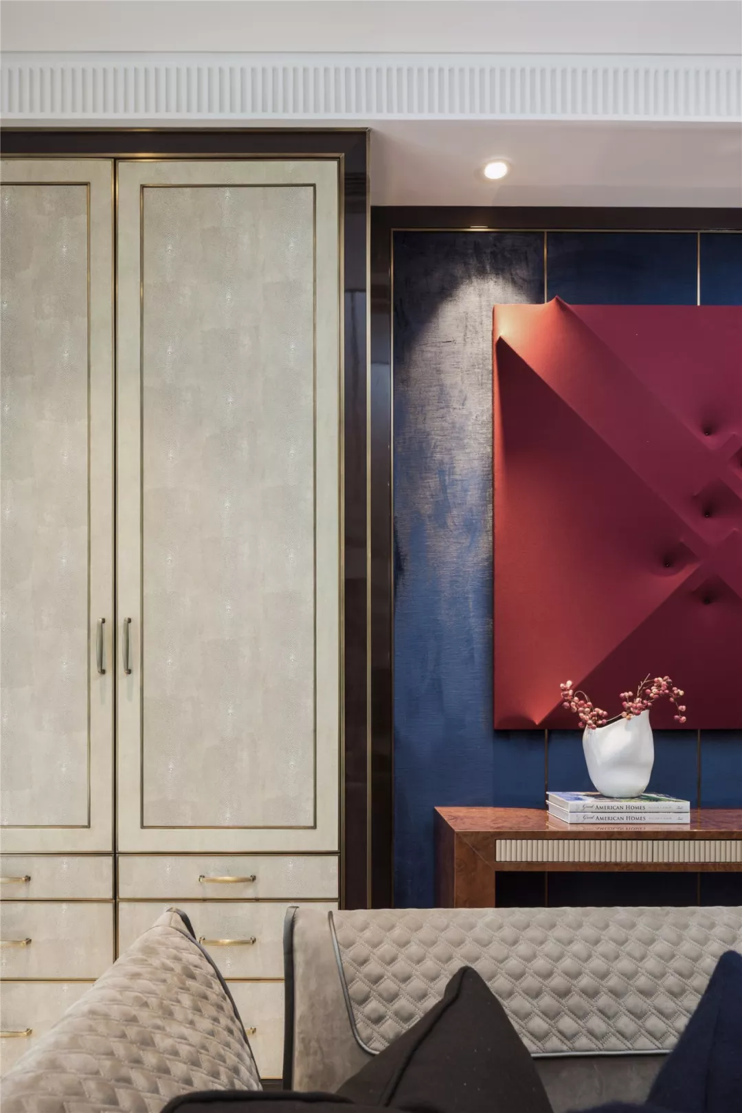 主人书房则用了一整面墙的,暗红色真丝墙布做主打色,搭配深咖色的阿玛尼酒柜,为卧室带入浪漫优雅的儒雅情调。