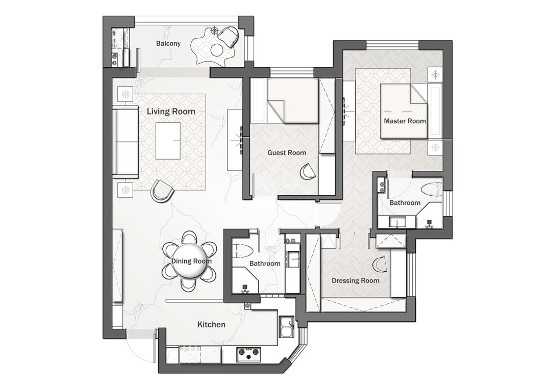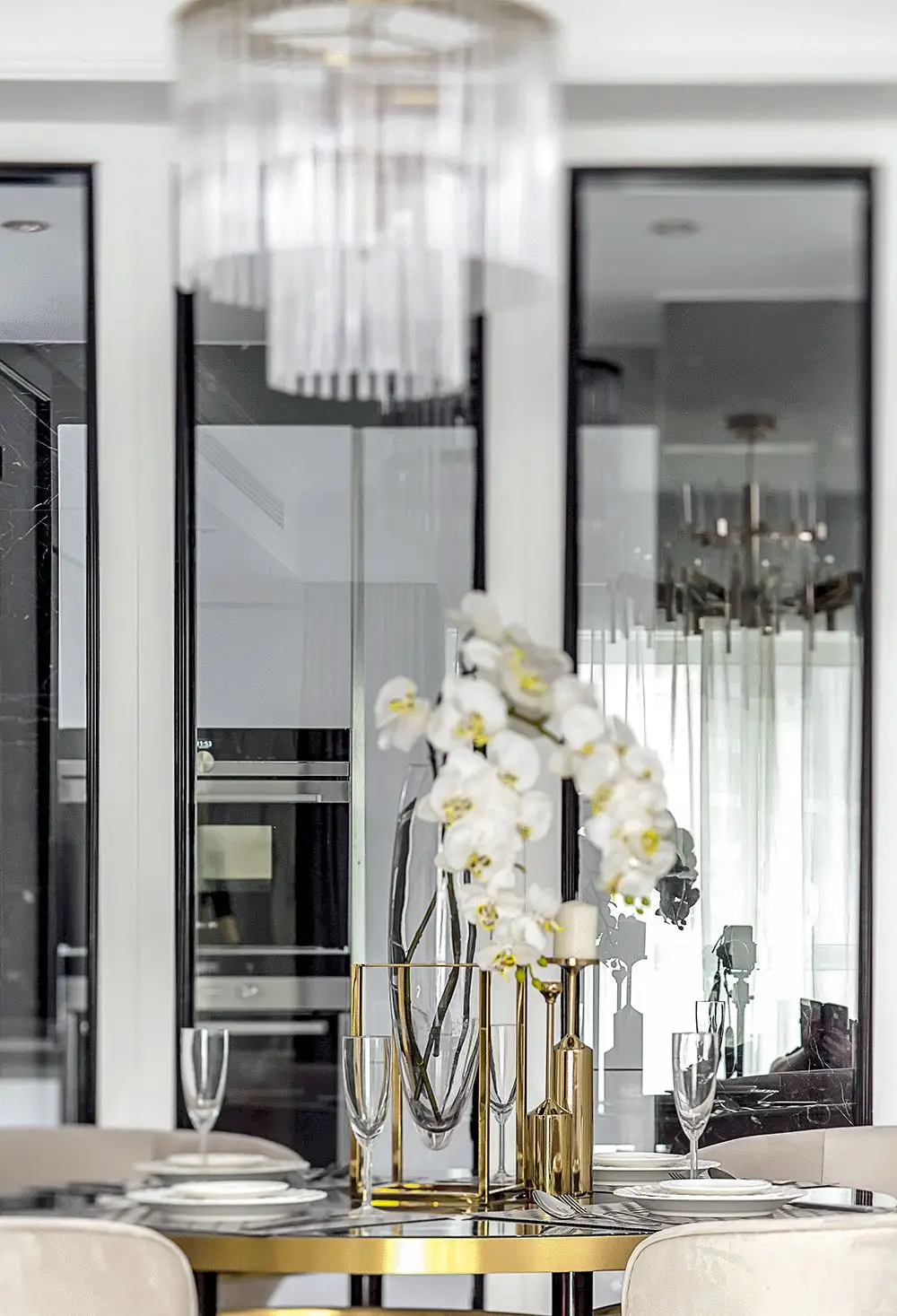 在这个案例中,除了黄铜和大理石的相得益彰、交相辉映外,黑白色的几何线条、细脚元素、轻体量的功能性家具等,都为整体颜值加分不少,让原本简洁的空间更添层次。