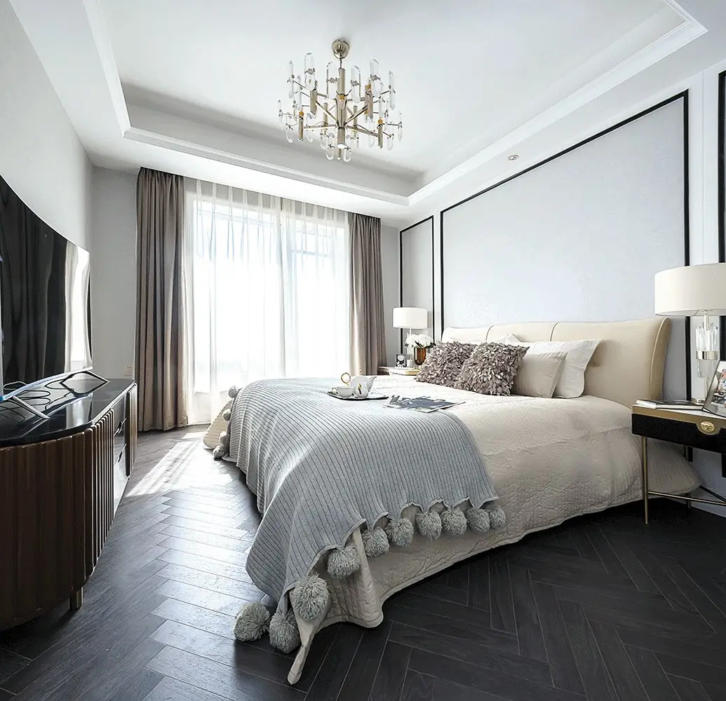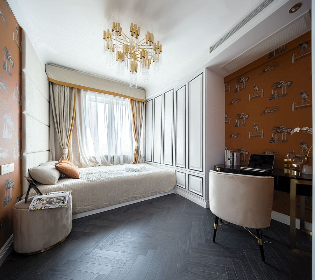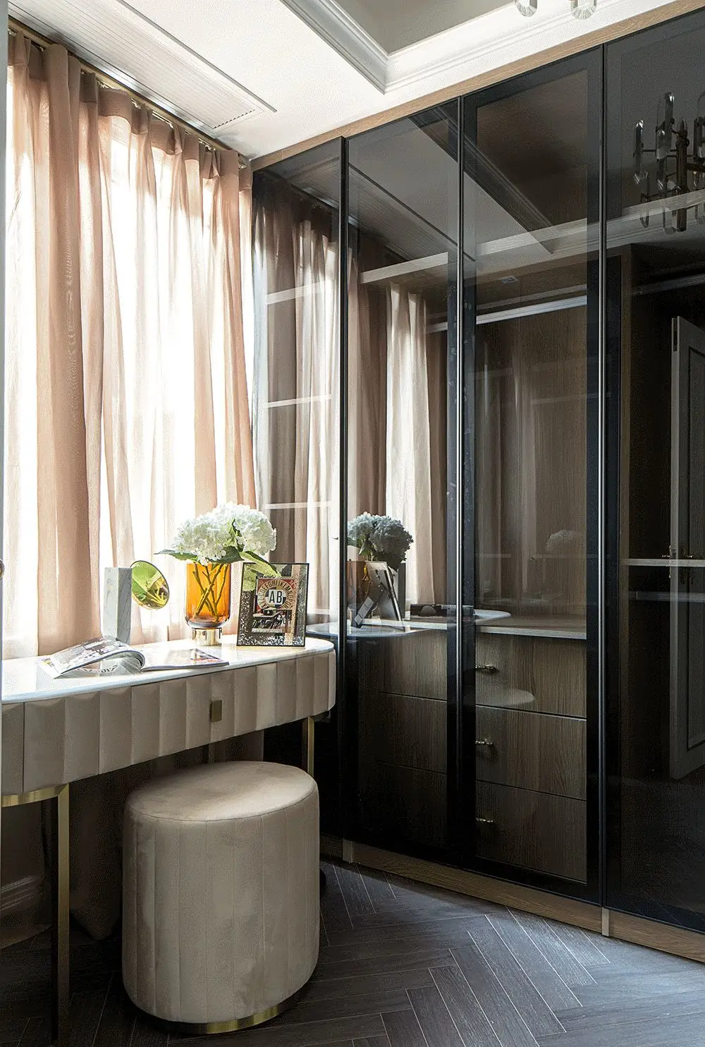 在色彩运用上,设计师特意选择了优雅大气的米杏色作为主调,它的颜色十分柔和,比白色更多了几分温暖和高贵。同时,“雾霾蓝”和赭石色的局部点缀,既不影响空间氛围,又可以起到画龙点睛的作用,空间气质瞬间提升。